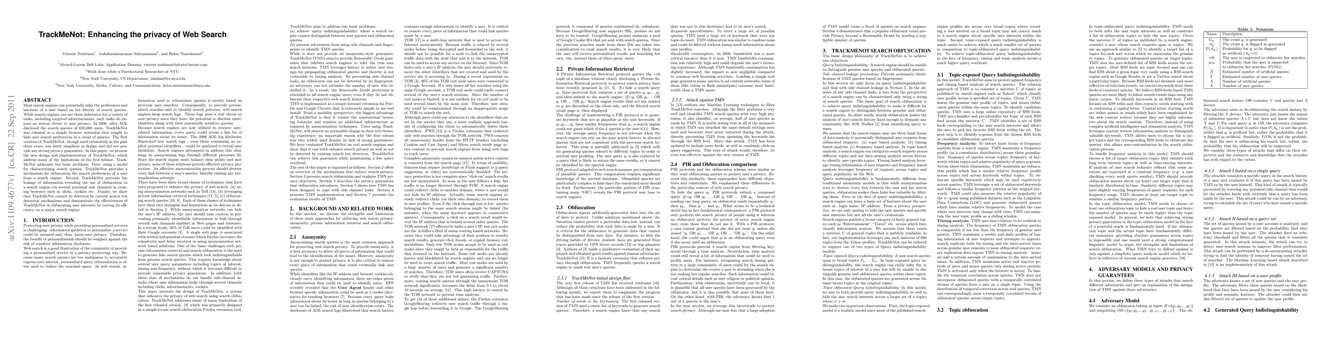 Most search engines can potentially infer the preferences and interests of a user based on her history of search queries. While search engines can use these inferences for a variety of tasks, including targeted advertisements, such tasks do impose an serious threat to user privacy. In 2006, after AOL disclosed the search queries of 650,000 users, TrackMeNot was released as a simple browser extension that sought to hide user search preferences in a cloud of queries. The first versions of TrackMeNot, though used extensively in the past three years, was fairly simplistic in design and did not provide any strong privacy guarantees. In this paper, we present the new design and implementation of TrackMeNot, which address many of the limitations of the first release. TrackMeNot addresses two basic problems. First, using a model for characterizing search queries, TrackMeNot provides a mechanism for obfuscating the search preferences of a user from a search engine. Second, TrackMeNot prevents the leakage of information revealing the use of obfuscation to a search engine via several potential side channels in existing browsers such as clicks, cookies etc. Finally, we show that TrackMeNot cannot be detected by current search bot detection mechanisms and demonstrate the effectiveness of TrackMeNot in obfuscating user interests by testing its efficiency on a major search engine.