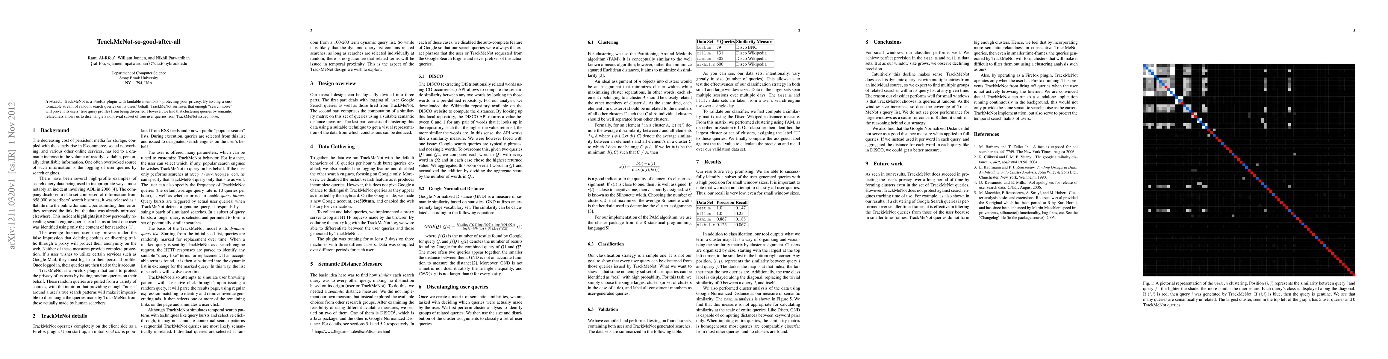 TrackMeNot is a Firefox plugin with laudable intentions - protecting your privacy. By issuing a customizable stream of random search queries on its users' behalf, TrackMeNot surmises that enough search noise will prevent its users' true query profiles from being discerned. However, we find that clustering queries by semantic relatedness allows us to disentangle a nontrivial subset of true user queries from TrackMeNot issued noise.