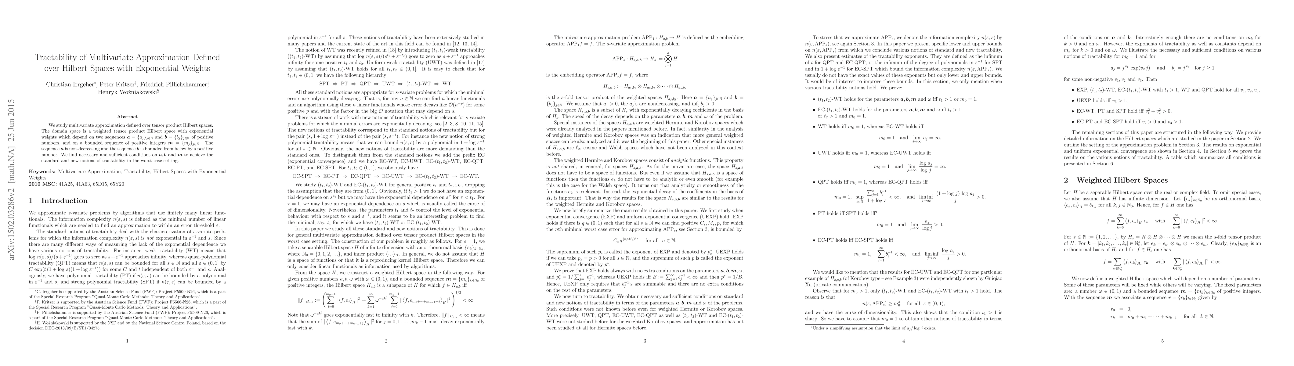 This paper investigates multivariate approximation in tensor product Hilbert spaces with exponential weights, identifying necessary and sufficient conditions for standard and new notions of tractability based on the sequences $\boldsymbol{a}$, $\boldsymbol{b}$, and $\boldsymbol{m}$. The study focuses on the weighted domain space defined by these sequences.
