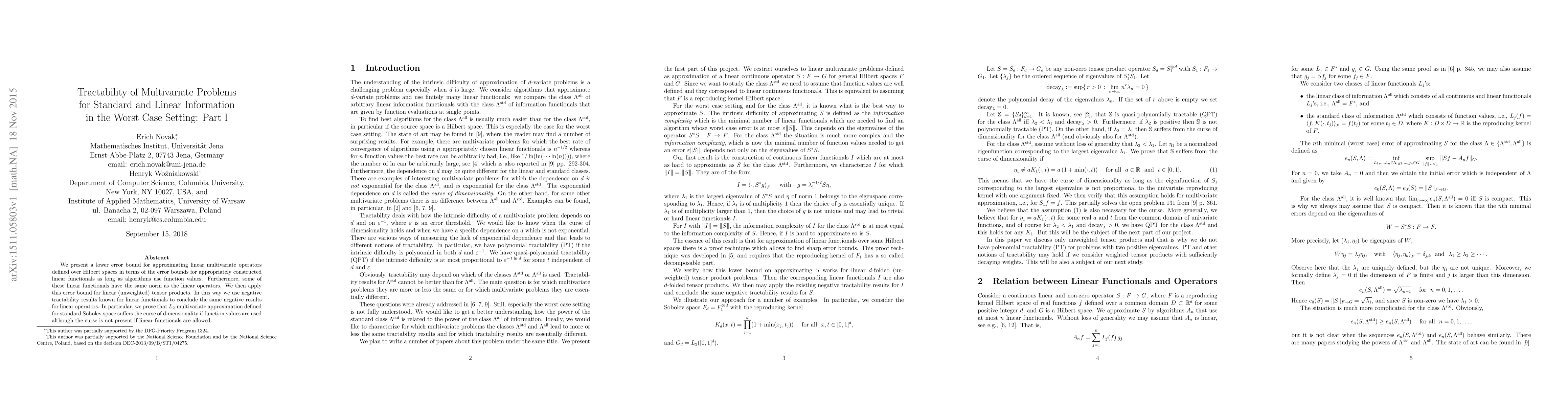 The paper presents a lower error bound for approximating linear multivariate operators over Hilbert spaces using function values, and applies this bound to linear tensor products, demonstrating negative tractability results for both linear functionals and operators.