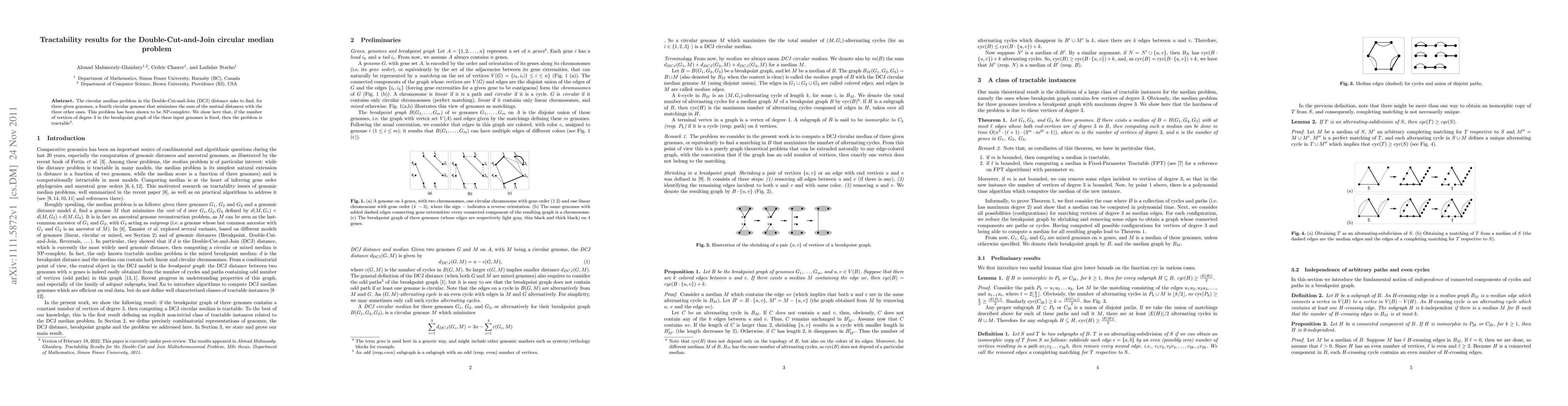 Summary: The Double-Cut-and-Join circular median problem is NP-complete but becomes tractable when the number of vertices of degree 3 in the breakpoint graph of three input genomes is fixed.