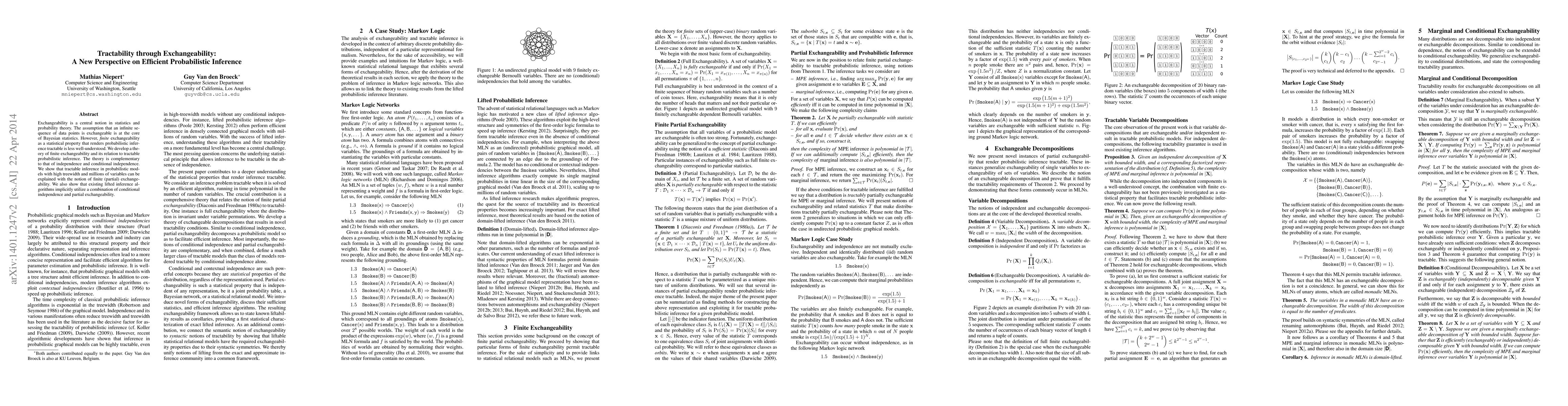 This paper develops a theory of finite exchangeability to enhance tractable probabilistic inference, showing its complementary role to independence. It demonstrates that inference in complex models with high treewidth and many variables can leverage finite exchangeability, revealing that existing lifted inference algorithms implicitly combine conditional independence and partial exchangeability.