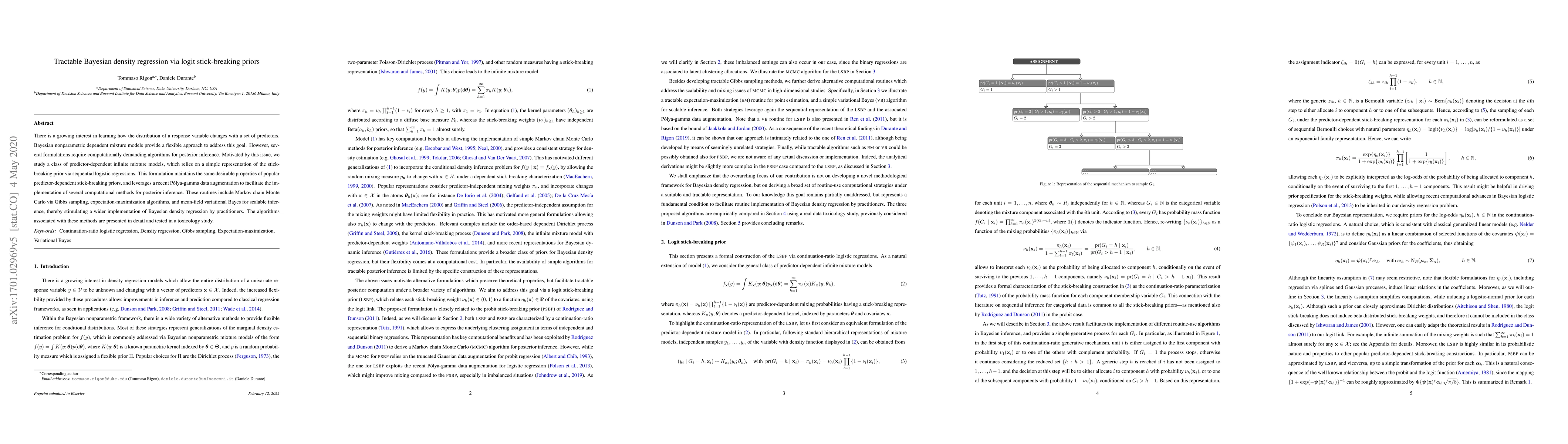 This paper proposes a tractable Bayesian density regression method using logit stick-breaking priors and Pólya-gamma data augmentation, enabling efficient posterior inference through Gibbs sampling, EM algorithms, and variational Bayes. The approach is demonstrated in a toxicology study.
