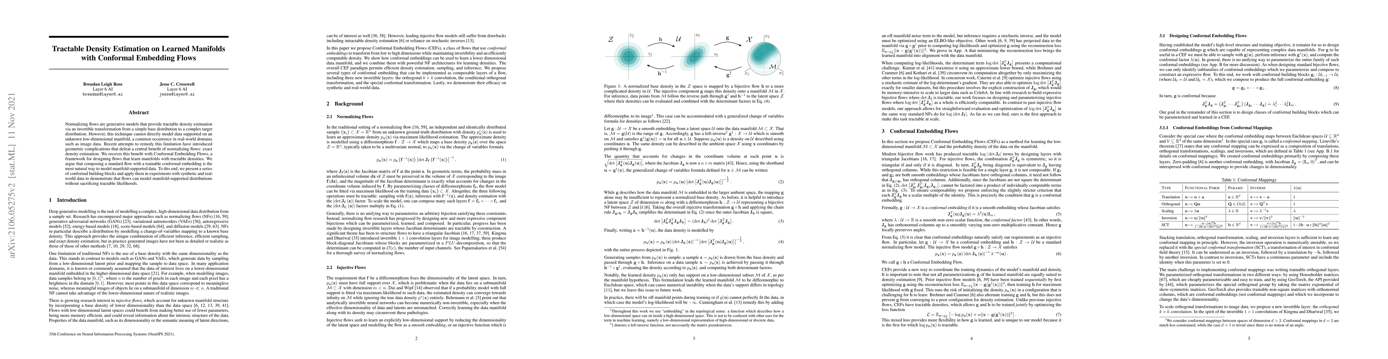 This paper introduces Conformal Embedding Flows, a framework that combines normalizing flows with trainable conformal embeddings to model data on unknown low-dimensional manifolds while maintaining tractable density estimation. The proposed method demonstrates successful modeling of manifold-supported distributions in both synthetic and real-world datasets.