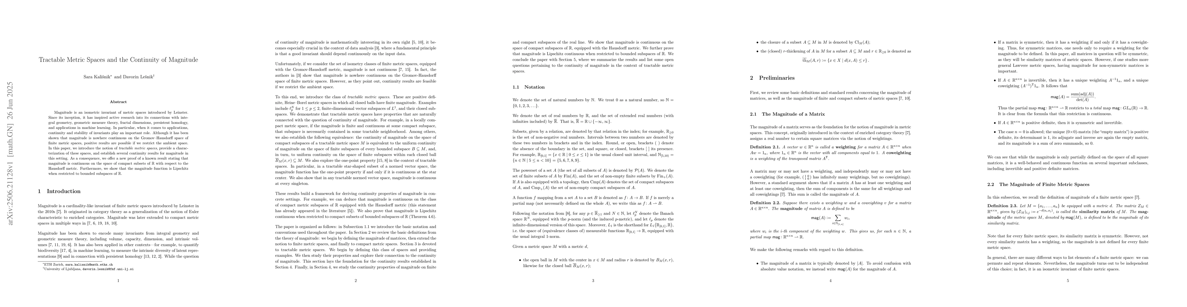 The paper introduces the class of tractable metric spaces and provides a comprehensive characterization of their properties, establishing key continuity results for the magnitude function within this framework.