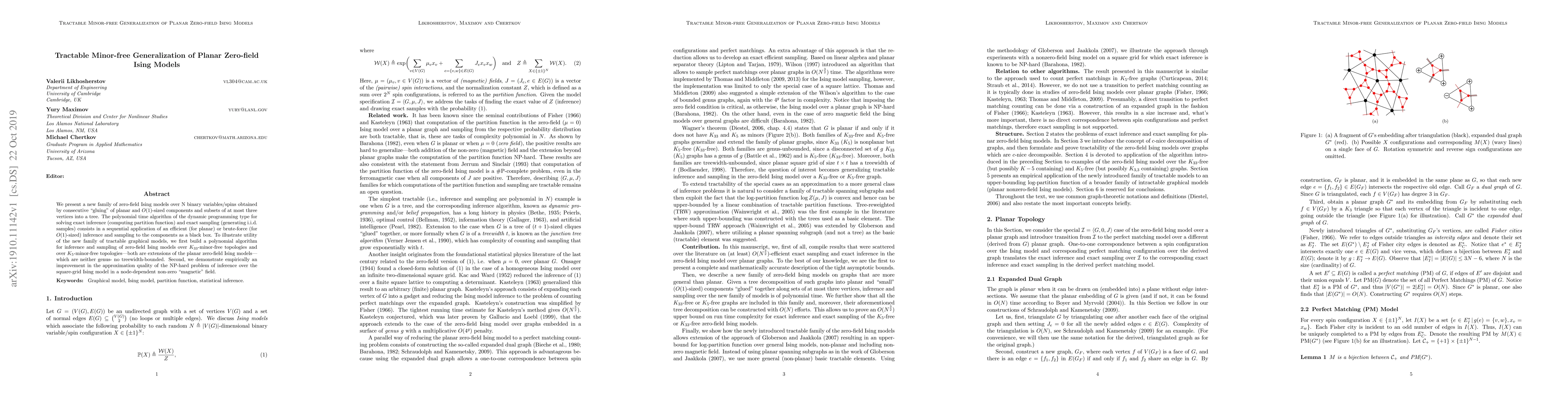 We present a new family of zero-field Ising models over $N$ binary variables/spins obtained by consecutive "gluing" of planar and $O(1)$-sized components and subsets of at most three vertices into a tree. The polynomial-time algorithm of the dynamic programming type for solving exact inference (computing partition function) and exact sampling (generating i.i.d. samples) consists in a sequential application of an efficient (for planar) or brute-force (for $O(1)$-sized) inference and sampling to the components as a black box. To illustrate the utility of the new family of tractable graphical models, we first build a polynomial algorithm for inference and sampling of zero-field Ising models over $K_{3,3}$-minor-free topologies and over $K_{5}$-minor-free topologies -- both are extensions of the planar zero-field Ising models -- which are neither genus - nor treewidth-bounded. Second, we demonstrate empirically an improvement in the approximation quality of the NP-hard problem of inference over the square-grid Ising model in a node-dependent non-zero "magnetic" field.