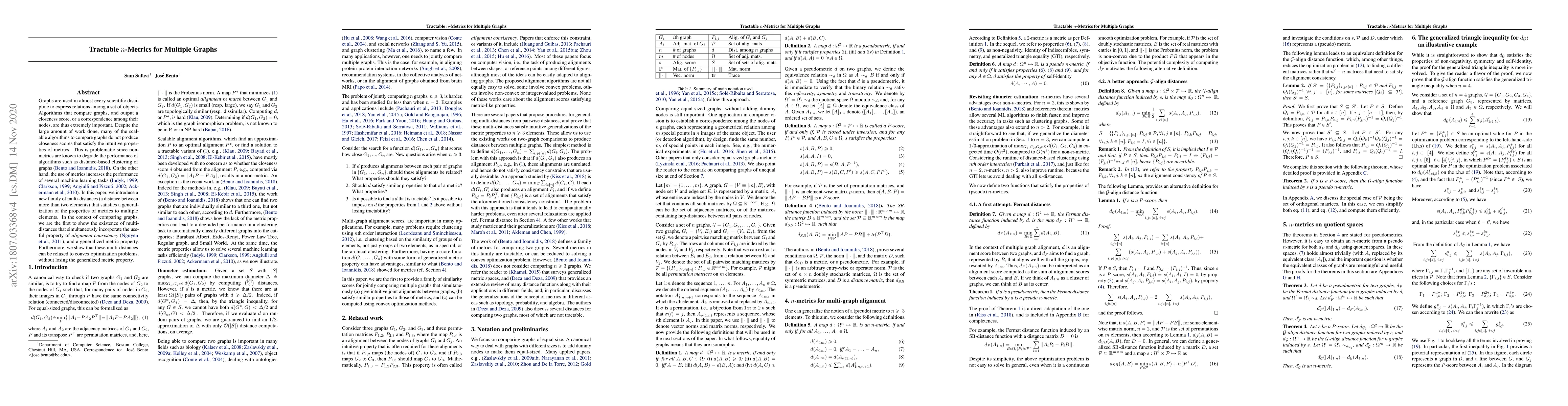 Graphs are used in almost every scientific discipline to express relations among a set of objects. Algorithms that compare graphs, and output a closeness score, or a correspondence among their nodes, are thus extremely important. Despite the large amount of work done, many of the scalable algorithms to compare graphs do not produce closeness scores that satisfy the intuitive properties of metrics. This is problematic since non-metrics are known to degrade the performance of algorithms such as distance-based clustering of graphs (Stratis and Bento 2018). On the other hand, the use of metrics increases the performance of several machine learning tasks (Indyk et al. 1999, Clarkson et al. 1999, Angiulli et al. 2002, Ackermann et al. 2010). In this paper, we introduce a new family of multi-distances (a distance between more than two elements) that satisfies a generalization of the properties of metrics to multiple elements. In the context of comparing graphs, we are the first to show the existence of multi-distances that simultaneously incorporate the useful property of alignment consistency (Nguyen et al. 2011), and a generalized metric property. Furthermore, we show that these multi-distances can be relaxed to convex optimization problems, without losing the generalized metric property.