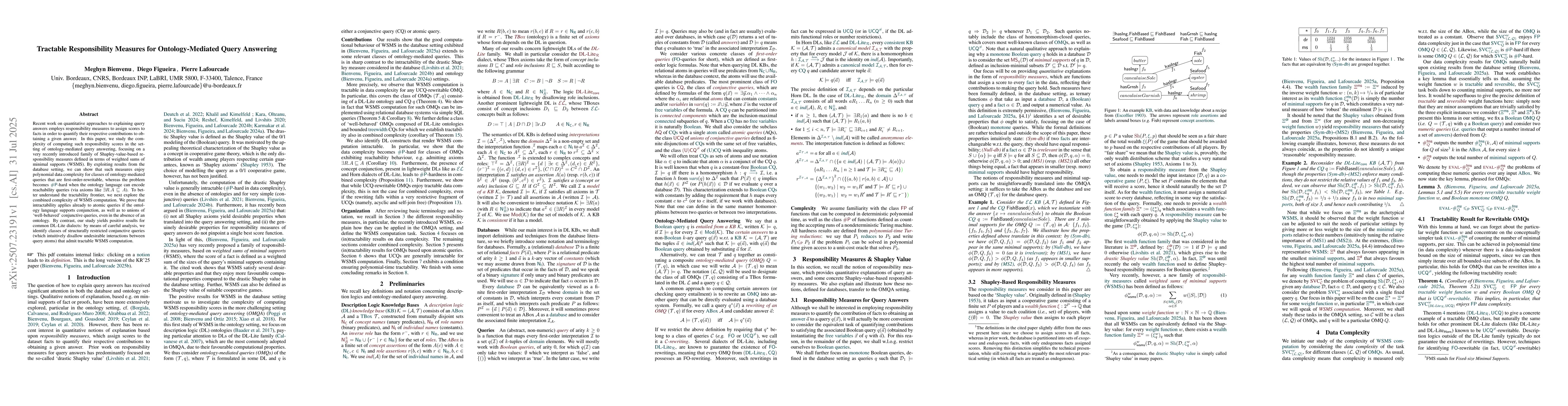 Recent work on quantitative approaches to explaining query answers employs responsibility measures to assign scores to facts in order to quantify their respective contributions to obtaining a given answer. In this paper, we study the complexity of computing such responsibility scores in the setting of ontology-mediated query answering, focusing on a very recently introduced family of Shapley-value-based responsibility measures defined in terms of weighted sums of minimal supports (WSMS). By exploiting results from the database setting, we can show that such measures enjoy polynomial data complexity for classes of ontology-mediated queries that are first-order-rewritable, whereas the problem becomes "shP"-hard when the ontology language can encode reachability queries (via axioms like $\exists R. A \sqsubseteq A$). To better understand the tractability frontier, we next explore the combined complexity of WSMS computation. We prove that intractability applies already to atomic queries if the ontology language supports conjunction, as well as to unions of `well-behaved' conjunctive queries, even in the absence of an ontology. By contrast, our study yields positive results for common DL-Lite dialects: by means of careful analysis, we identify classes of structurally restricted conjunctive queries (which intuitively disallow undesirable interactions between query atoms) that admit tractable WSMS computation.