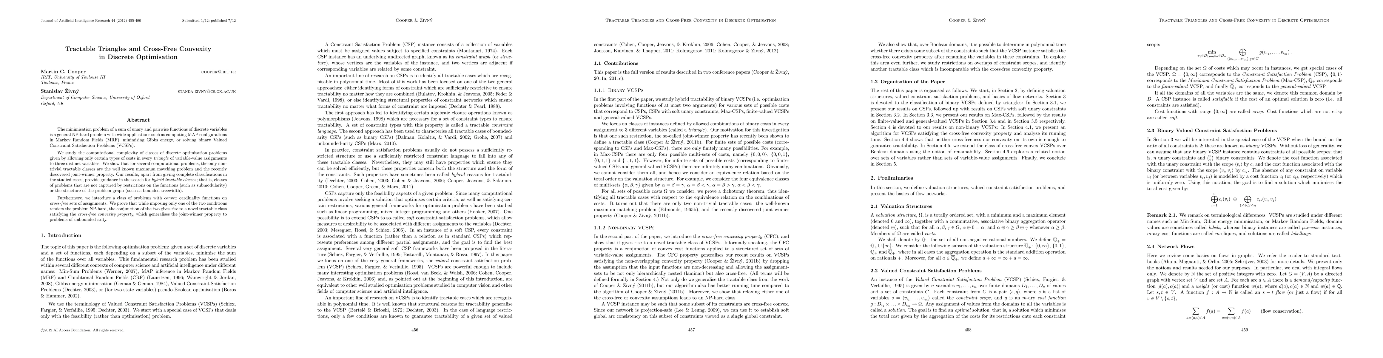 The minimisation problem of a sum of unary and pairwise functions of discrete variables is a general NP-hard problem with wide applications such as computing MAP configurations in Markov Random Fields (MRF), minimising Gibbs energy, or solving binary Valued Constraint Satisfaction Problems (VCSPs). We study the computational complexity of classes of discrete optimisation problems given by allowing only certain types of costs in every triangle of variable-value assignments to three distinct variables. We show that for several computational problems, the only non- trivial tractable classes are the well known maximum matching problem and the recently discovered joint-winner property. Our results, apart from giving complete classifications in the studied cases, provide guidance in the search for hybrid tractable classes; that is, classes of problems that are not captured by restrictions on the functions (such as submodularity) or the structure of the problem graph (such as bounded treewidth). Furthermore, we introduce a class of problems with convex cardinality functions on cross-free sets of assignments. We prove that while imposing only one of the two conditions renders the problem NP-hard, the conjunction of the two gives rise to a novel tractable class satisfying the cross-free convexity property, which generalises the joint-winner property to problems of unbounded arity.