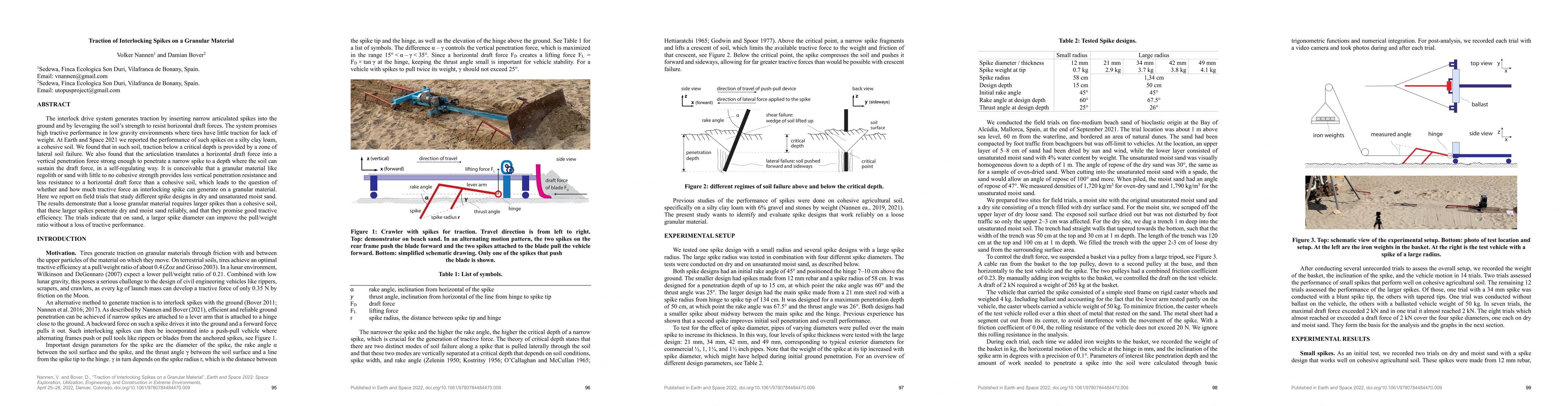 This study investigates the performance of interlocking spike drive systems in granular materials like sand, finding that larger spikes provide better traction and tractive efficiency compared to cohesive soils. Field trials show that spikes can reliably penetrate dry and moist sand, suggesting improved pull/weight ratios with larger spike diameters.