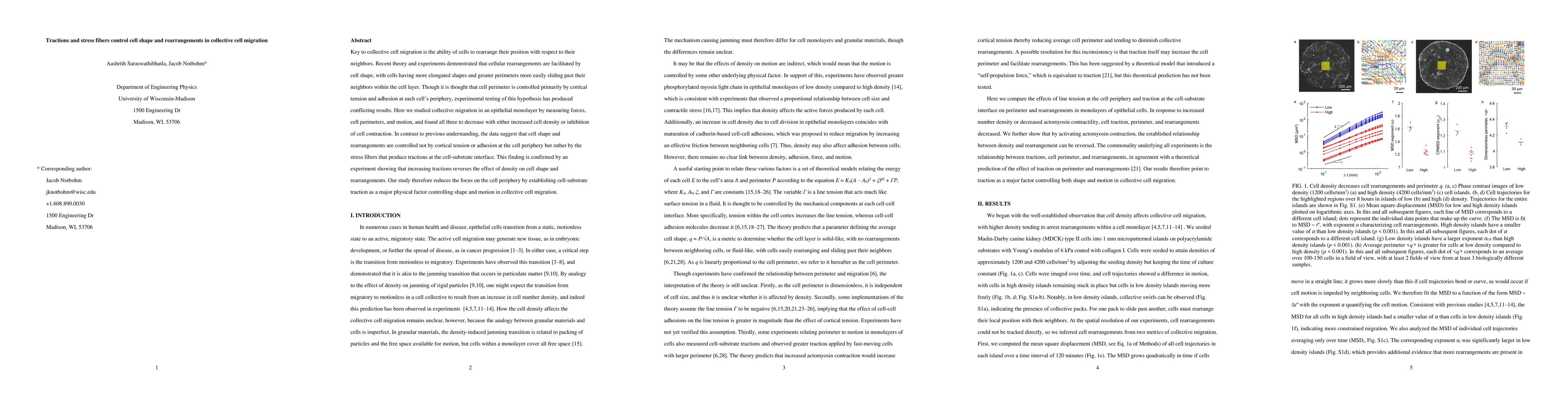 This study reveals that stress fibers generating tractions at the cell-substrate interface, rather than cortical tension or adhesion at the cell periphery, primarily control cell shape and rearrangements in collective cell migration. Increased tractions can reverse the effects of cell density on these factors, highlighting the importance of cell-substrate interactions in collective cell migration.