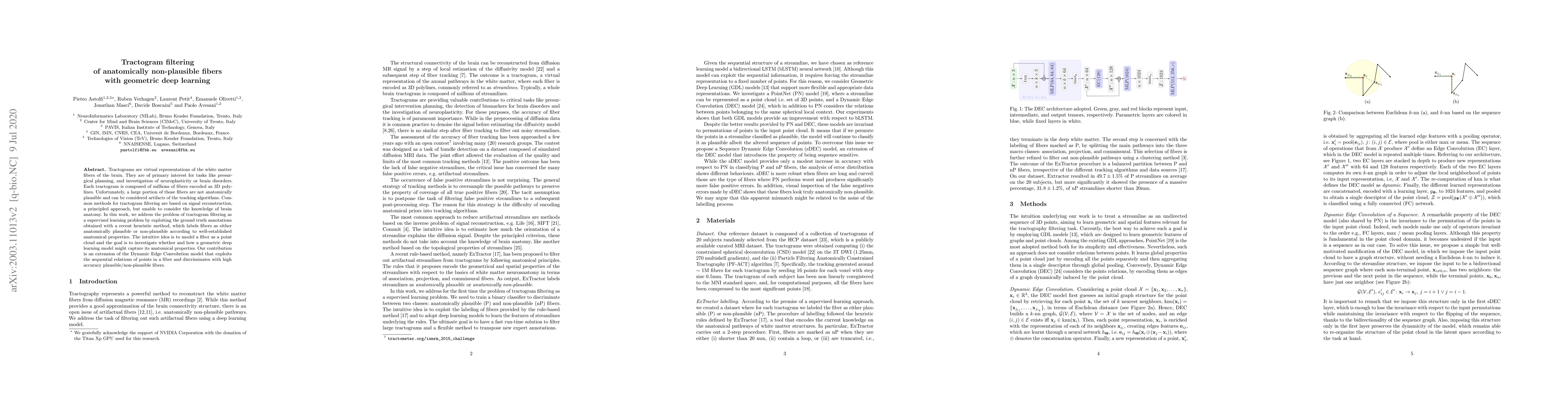 This paper proposes a geometric deep learning model to filter anatomically non-plausible fibers in tractograms, using Dynamic Edge Convolution to exploit sequential relations of points in fibers and achieve high accuracy in discrimination. The method leverages ground truth annotations for training, aiming to improve the reliability of tractograms for brain-related applications.