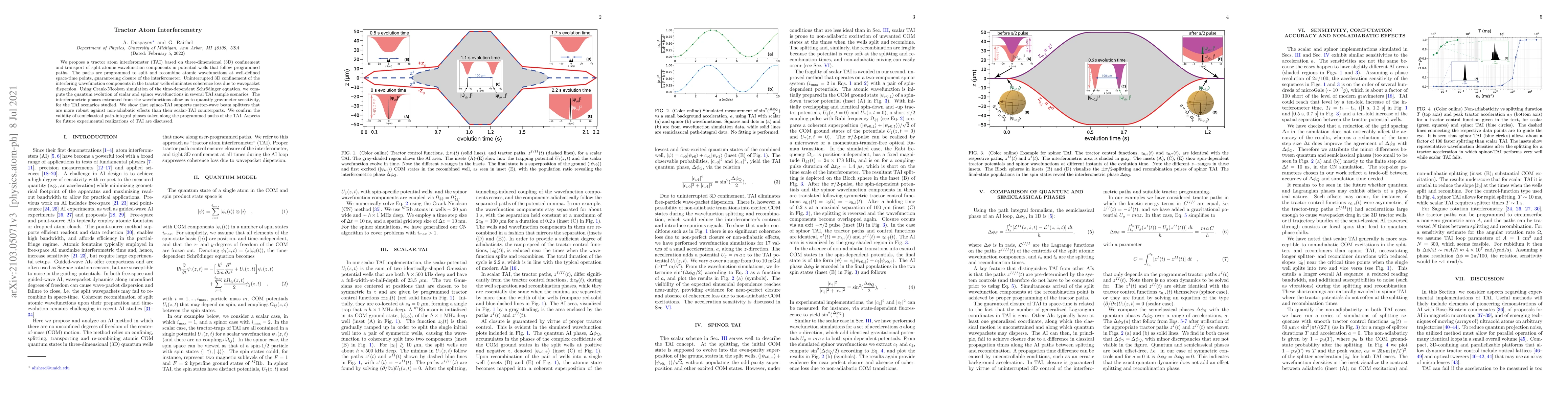 We propose a tractor atom interferometer (TAI) based on three-dimensional (3D) confinement and transport of split atomic wavefunction components in potential wells that follow programmed paths. The paths are programmed to split and recombine atomic wavefunctions at well-defined space-time points, guaranteeing closure of the interferometer. Uninterrupted 3D confinement of the interfering wavefunction components in the tractor wells eliminates coherence loss due to wavepacket dispersion. Using Crank-Nicolson simulation of the time-dependent Schr\"odinger equation, we compute the quantum evolution of scalar and spinor wavefunctions in several TAI sample scenarios. The interferometric phases extracted from the wavefunctions allow us to quantify gravimeter sensitivity, for the TAI scenarios studied. We show that spinor-TAI supports matter-wave beam splitters that are more robust against non-adiabatic effects than their scalar-TAI counterparts. We confirm the validity of semiclassical path-integral phases taken along the programmed paths of the TAI. Aspects for future experimental realizations of TAI are discussed.
