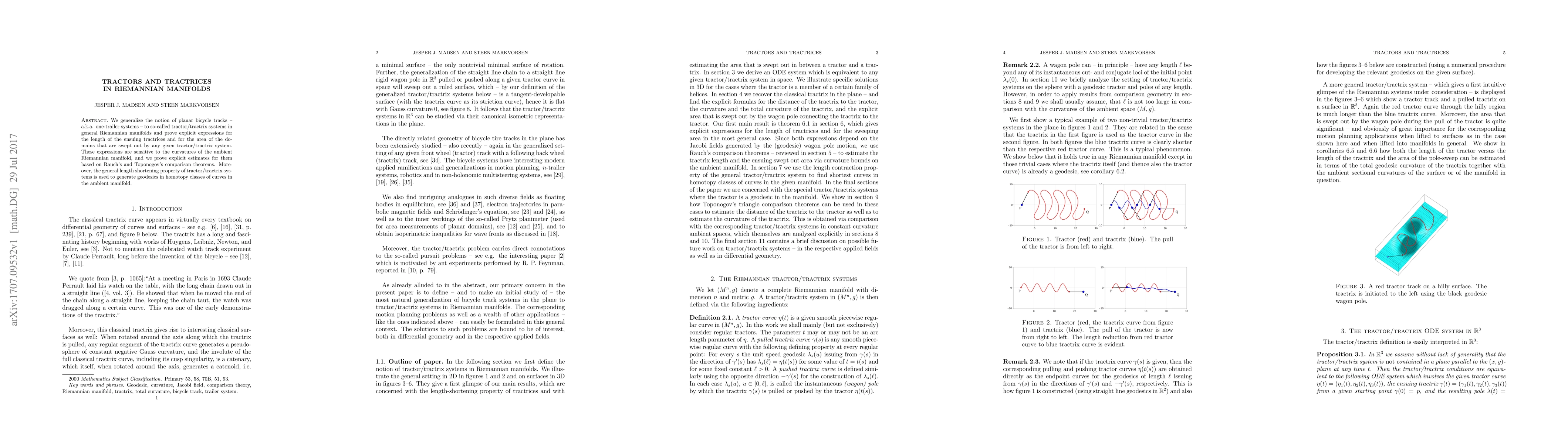 This paper generalizes the concept of bicycle tracks to Riemannian manifolds, introducing tractor/tractrix systems and deriving expressions for the length of tractrices and areas swept by these systems. It leverages curvature and comparison theorems to provide explicit estimates and uses the length-shortening property to generate geodesics.
