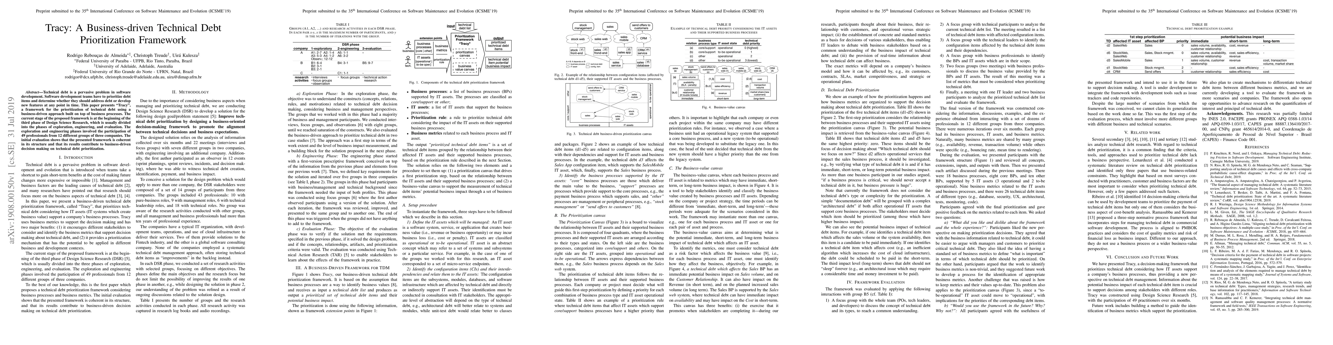 This paper introduces "Tracy," a framework for prioritizing technical debt based on business processes, developed through collaboration with 49 professionals from three companies. Initial evaluation indicates the framework's coherence and its potential to support business-driven decisions in technical debt management.