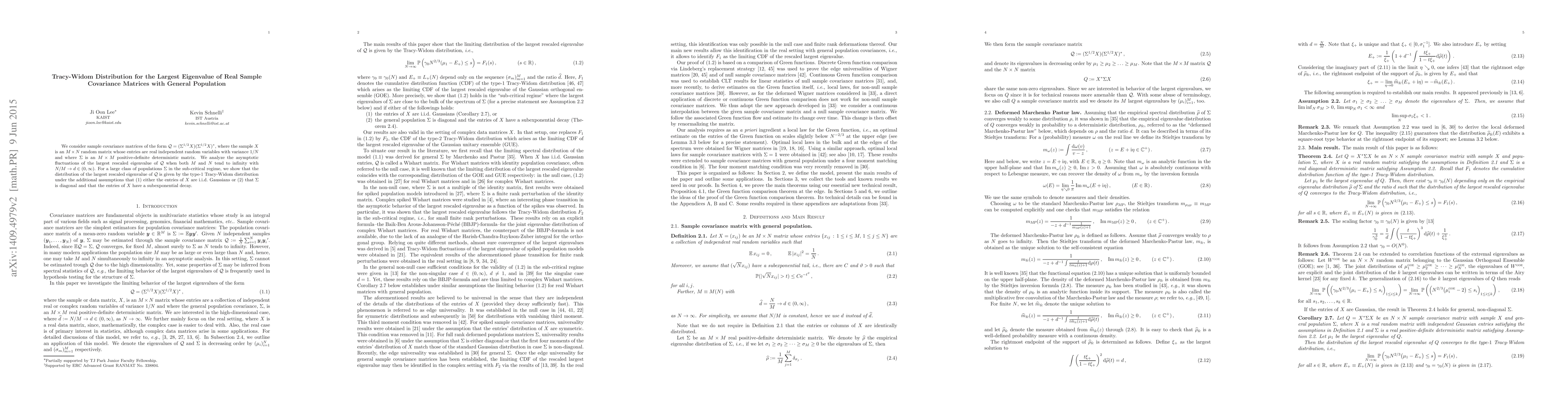 This paper investigates the asymptotic behavior of the largest eigenvalue of real sample covariance matrices, showing that under certain conditions, the distribution follows the Tracy-Widom type-1 distribution. The analysis is valid for a broad class of population matrices in the sub-critical regime.