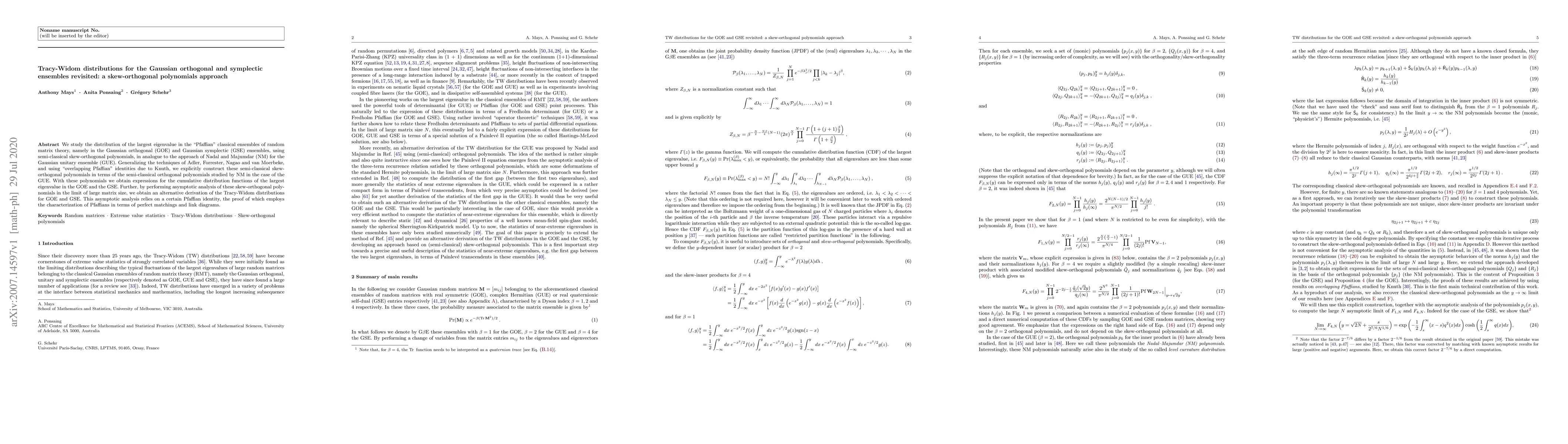 This paper revisits the Tracy-Widom distributions for the Gaussian orthogonal and symplectic ensembles using skew-orthogonal polynomials, generalizing techniques from the Gaussian unitary ensemble. It constructs these polynomials and derives expressions for the largest eigenvalue's cumulative distribution functions, ultimately obtaining the Tracy-Widom distributions through asymptotic analysis.
