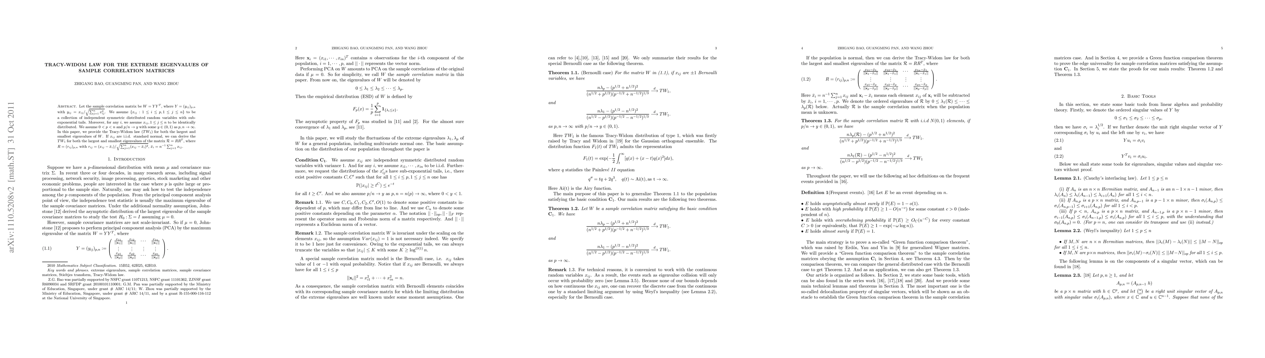 Let the sample correlation matrix be $W=YY^T$, where $Y=(y_{ij})_{p,n}$ with $y_{ij}=x_{ij}/\sqrt{\sum_{j=1}^nx_{ij}^2}$. We assume $\{x_{ij}: 1\leq i\leq p, 1\leq j\leq n\}$ to be a collection of independent symmetric distributed random variables with sub-exponential tails. Moreover, for any $i$, we assume $x_{ij}, 1\leq j\leq n$ to be identically distributed. We assume $0