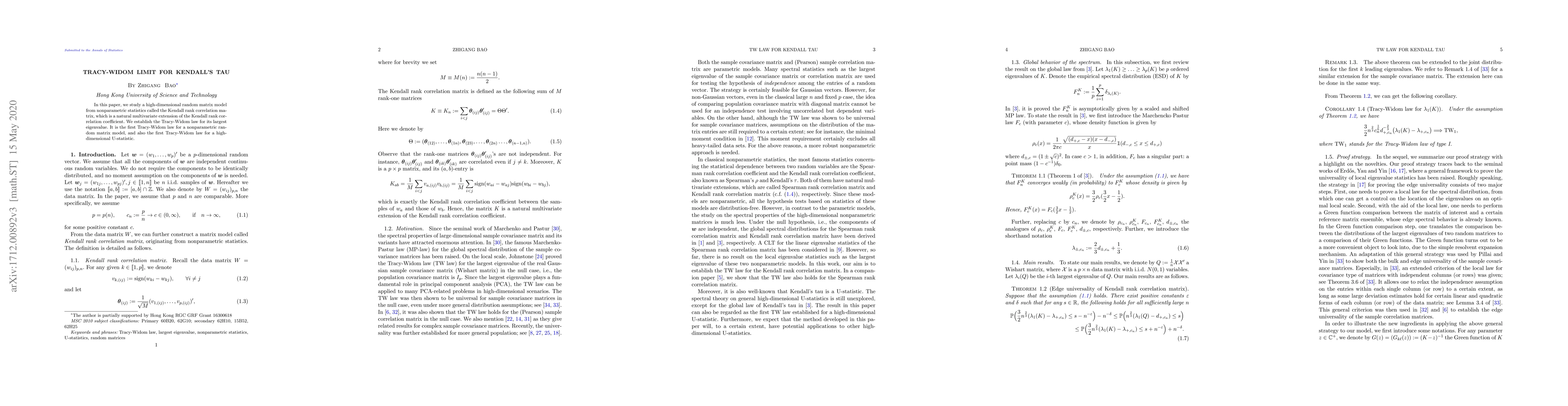 In this paper, we study a high-dimensional random matrix model from nonparametric statistics called the Kendall rank correlation matrix, which is a natural multivariate extension of the Kendall rank correlation coefficient. We establish the Tracy-Widom law for its largest eigenvalue. It is the first Tracy-Widom law for a nonparametric random matrix model, and also the first Tracy-Widom law for a high-dimensional U-statistic.
