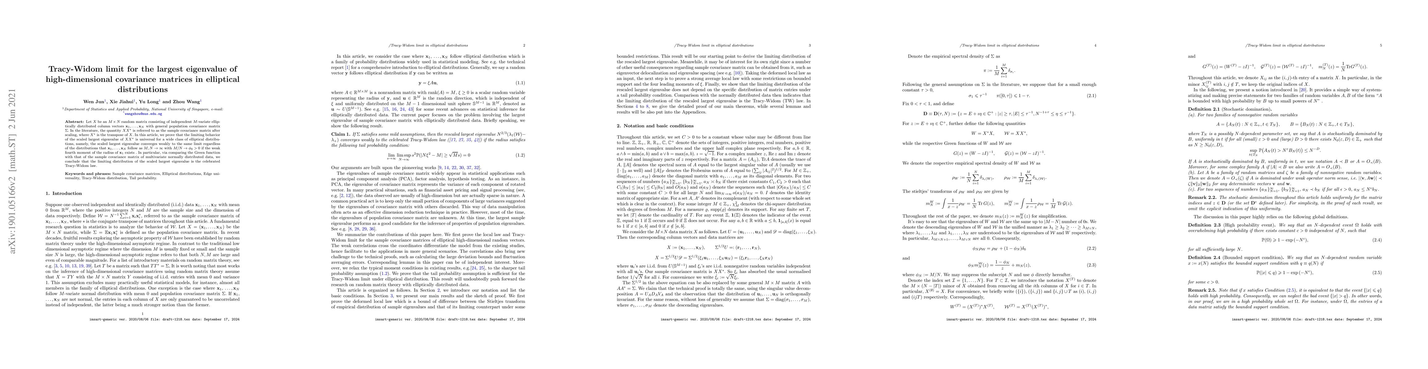 This paper proves that the largest eigenvalue of scaled high-dimensional sample covariance matrices from elliptical distributions converges to the Tracy-Widom limit, regardless of the underlying distribution, provided the weak fourth moment exists. This universality is demonstrated by comparing the Green function to that of the normal distribution.