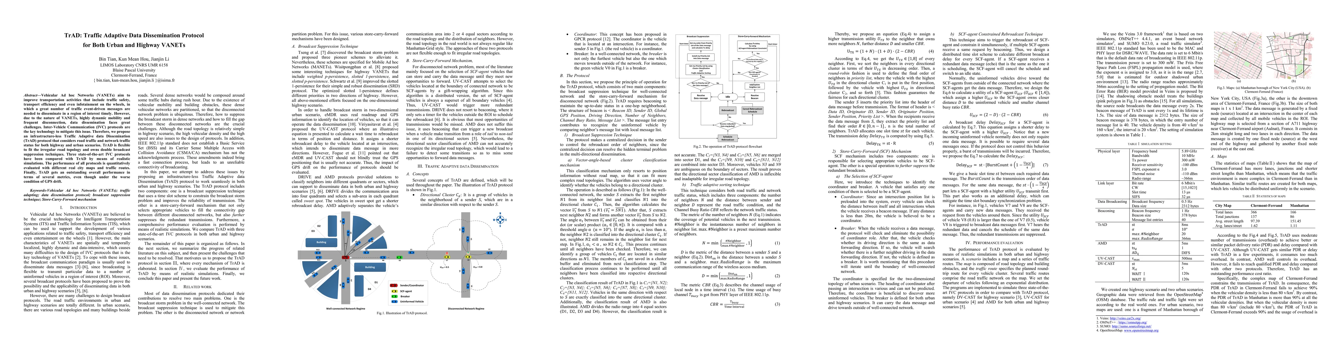 The TrAD protocol is an infrastructure-less data dissemination method for VANETs, designed to handle the dynamic nature of vehicular networks by adapting to both urban and highway traffic. TrAD outperforms three state-of-the-art protocols in simulations, demonstrating superior performance in various scenarios.