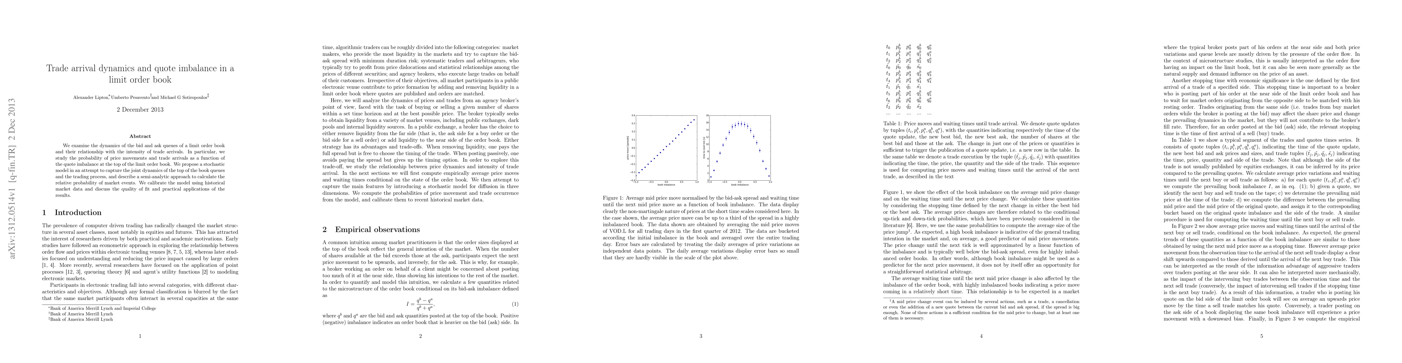 This paper investigates the relationship between trade arrival dynamics and quote imbalance in a limit order book, proposing a stochastic model to capture the joint dynamics of order queues and trading processes. The study uses historical data to calibrate the model and assess its fit, aiming to understand the probability of price movements and trade arrivals relative to quote imbalance.