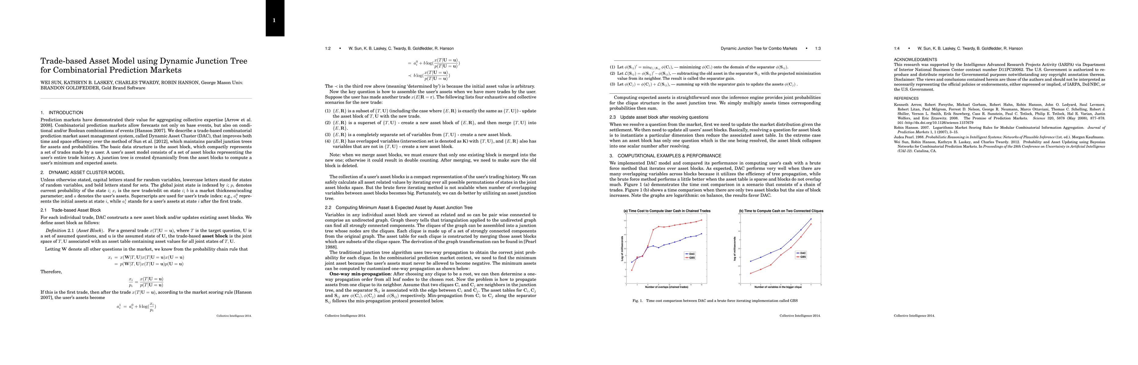 This paper introduces Dynamic Asset Cluster (DAC), a system for managing trade-based combinatorial prediction markets. DAC improves efficiency by dynamically creating junction trees from asset blocks, which compactly represent user trades, surpassing previous methods that maintain parallel junction trees for assets and probabilities.