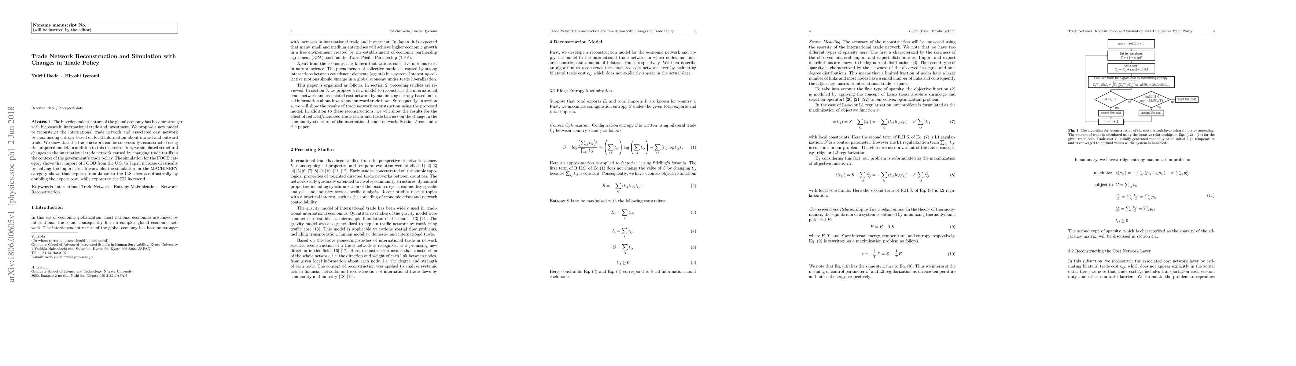 This paper proposes a new model for reconstructing the international trade network based on entropy maximization, demonstrating successful reconstruction. It also simulates the impact of trade policy changes, showing increased FOOD imports from the U.S. to Japan and decreased MACHINERY exports from Japan to the U.S. with altered tariffs.