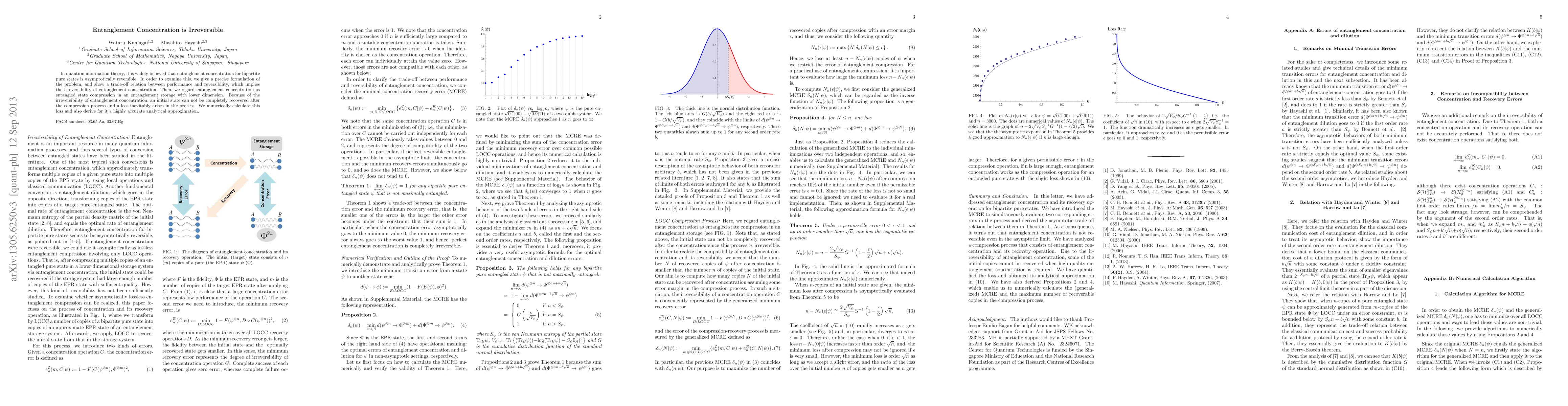 This paper investigates the trade-off between performance and reversibility in entanglement concentration for pure entangled states, demonstrating that entanglement concentration is inherently irreversible. It provides a numerical and analytical approximation for the loss incurred due to this irreversibility.