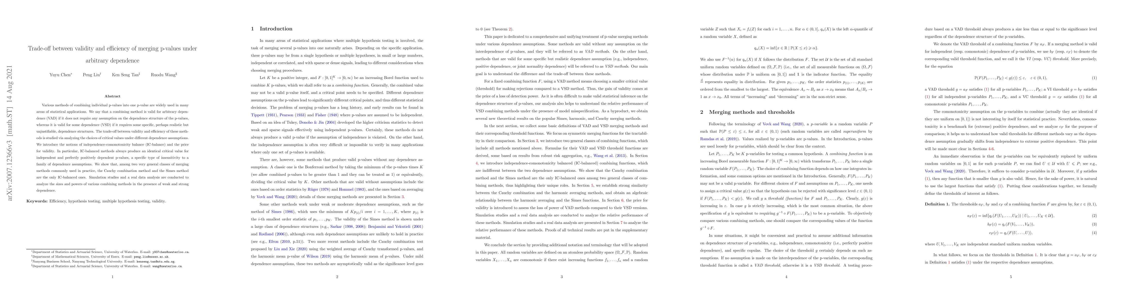 Various methods of combining individual p-values into one p-value are widely used in many areas of statistical applications. We say that a combining method is valid for arbitrary dependence (VAD) if it does not require any assumption on the dependence structure of the p-values, whereas it is valid for some dependence (VSD) if it requires some specific, perhaps realistic but unjustifiable, dependence structures. The trade-off between validity and efficiency of these methods is studied via analyzing the choices of critical values under different dependence assumptions. We introduce the notions of independence-comonotonicity balance (IC-balance) and the price for validity. In particular, IC-balanced methods always produce an identical critical value for independent and perfectly positively dependent p-values, a specific type of insensitivity to a family of dependence assumptions. We show that, among two very general classes of merging methods commonly used in practice, the Cauchy combination method and the Simes method are the only IC-balanced ones. Simulation studies and a real data analysis are conducted to analyze the sizes and powers of various combining methods in the presence of weak and strong dependence.