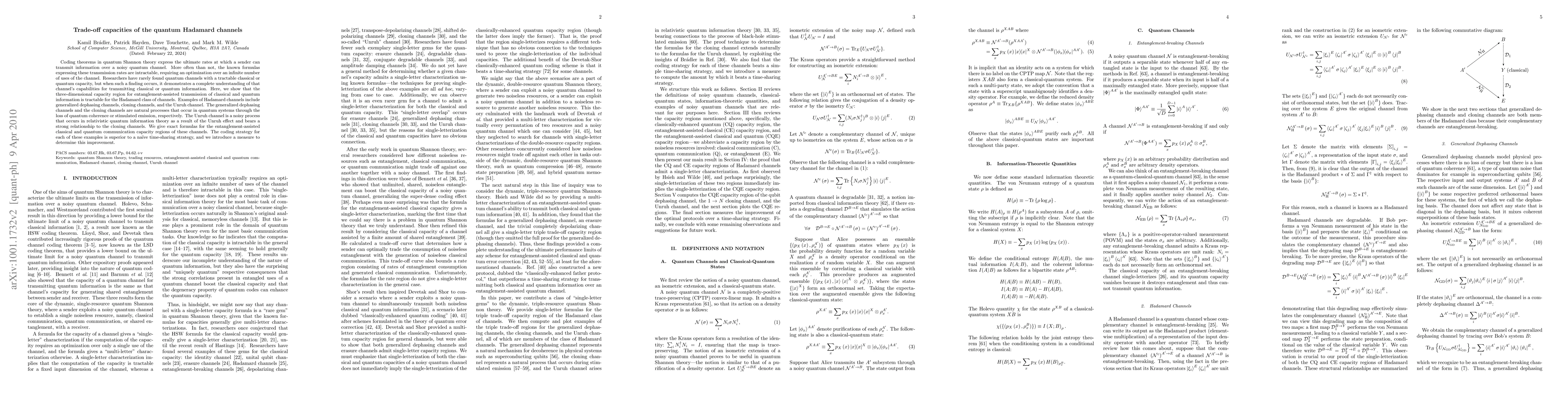 Coding theorems in quantum Shannon theory express the ultimate rates at which a sender can transmit information over a noisy quantum channel. More often than not, the known formulas expressing these transmission rates are intractable, requiring an optimization over an infinite number of uses of the channel. Researchers have rarely found quantum channels with a tractable classical or quantum capacity, but when such a finding occurs, it demonstrates a complete understanding of that channel's capabilities for transmitting classical or quantum information. Here, we show that the three-dimensional capacity region for entanglement-assisted transmission of classical and quantum information is tractable for the Hadamard class of channels. Examples of Hadamard channels include generalized dephasing channels, cloning channels, and the Unruh channel. The generalized dephasing channels and the cloning channels are natural processes that occur in quantum systems through the loss of quantum coherence or stimulated emission, respectively. The Unruh channel is a noisy process that occurs in relativistic quantum information theory as a result of the Unruh effect and bears a strong relationship to the cloning channels. We give exact formulas for the entanglement-assisted classical and quantum communication capacity regions of these channels. The coding strategy for each of these examples is superior to a naive time-sharing strategy, and we introduce a measure to determine this improvement.