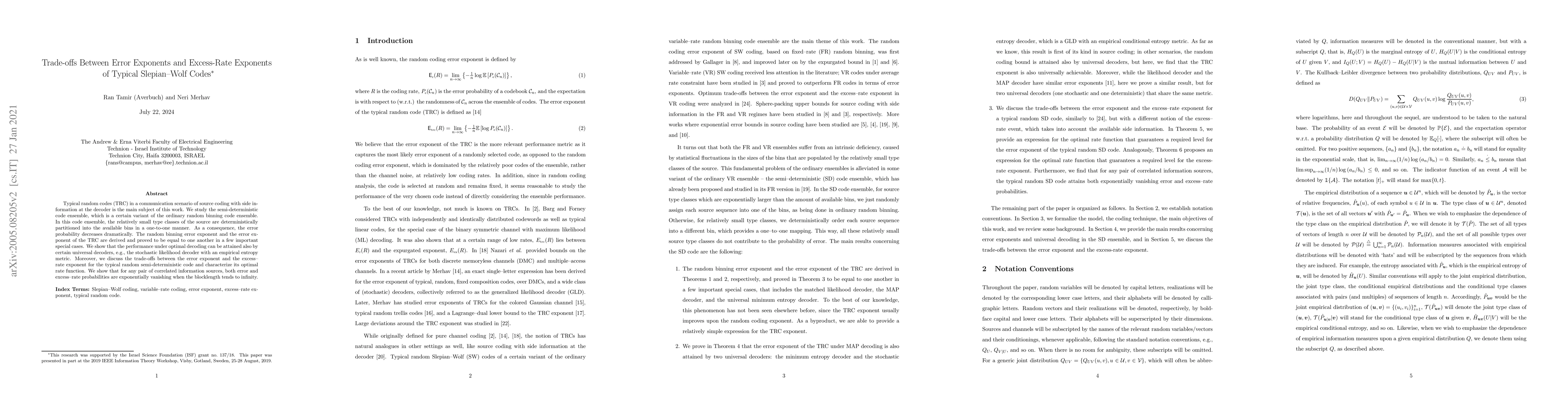 This paper investigates typical random codes (TRC) in source coding with side information, focusing on a semi-deterministic code ensemble that partitions small type classes into bins. It demonstrates the equivalence of error exponents between random binning and TRC in specific cases and explores trade-offs between error and excess-rate exponents, showing optimal performance through universal decoders.