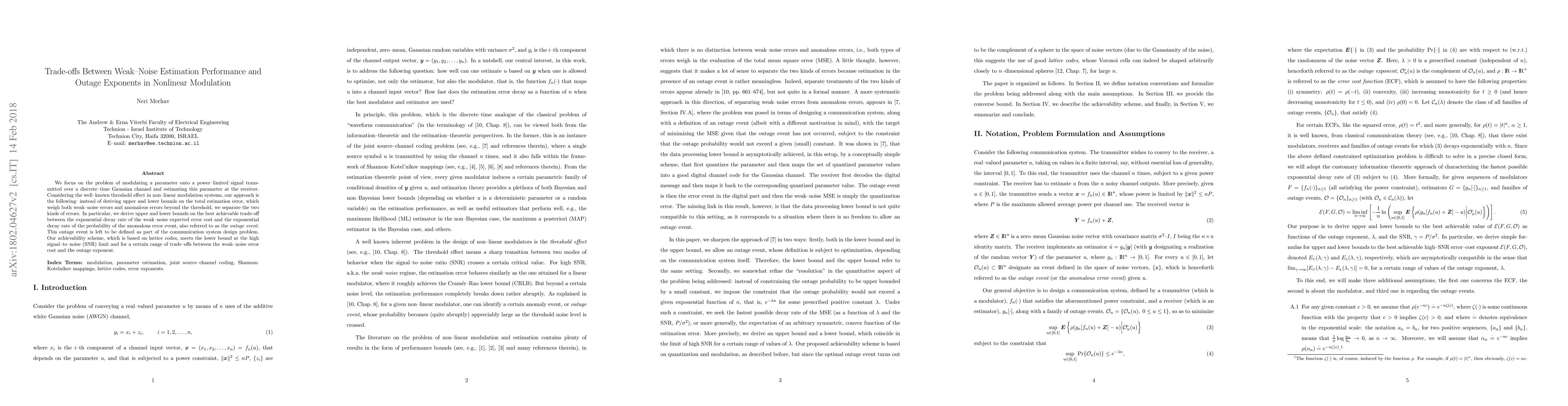 This paper investigates the trade-off between weak-noise estimation performance and outage exponents in nonlinear modulation systems over Gaussian channels. It separates weak-noise and anomalous errors, deriving bounds on their respective decay rates and proposing a lattice-based scheme that achieves these bounds under certain conditions.