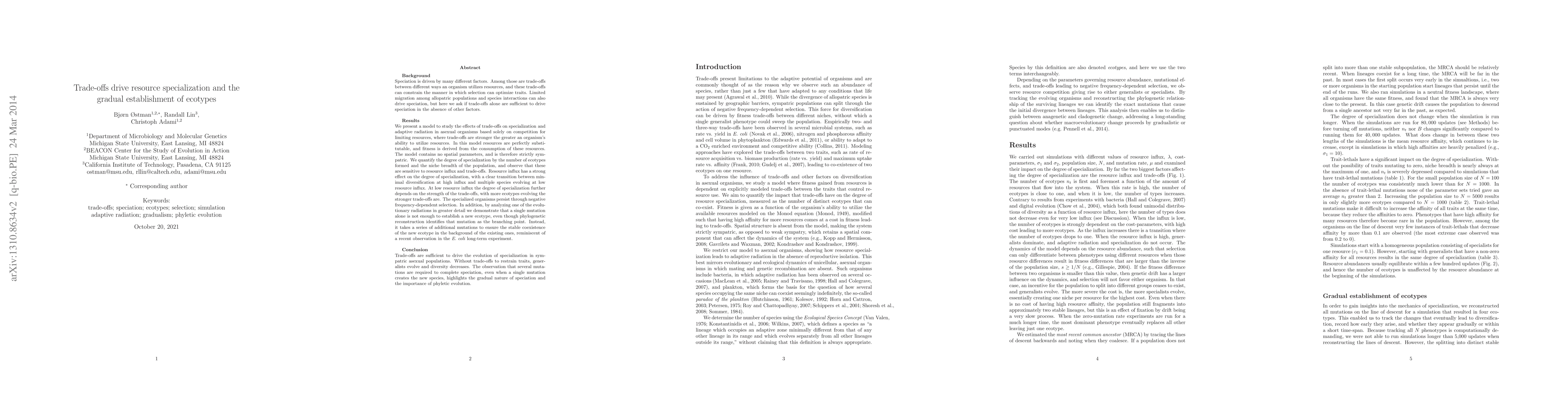 This paper explores how trade-offs in resource utilization drive the specialization and gradual establishment of ecotypes in asexual organisms, demonstrating that resource influx and the strength of trade-offs significantly influence the degree of specialization and adaptive radiation. It concludes that multiple mutations are necessary for the stable coexistence of new ecotypes.