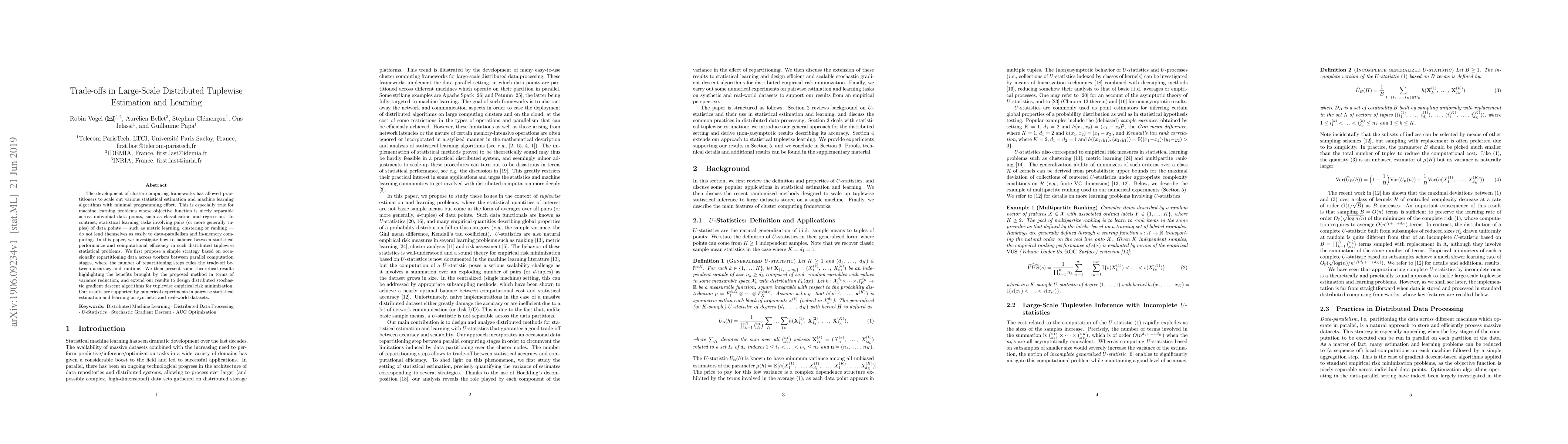 The development of cluster computing frameworks has allowed practitioners to scale out various statistical estimation and machine learning algorithms with minimal programming effort. This is especially true for machine learning problems whose objective function is nicely separable across individual data points, such as classification and regression. In contrast, statistical learning tasks involving pairs (or more generally tuples) of data points - such as metric learning, clustering or ranking do not lend themselves as easily to data-parallelism and in-memory computing. In this paper, we investigate how to balance between statistical performance and computational efficiency in such distributed tuplewise statistical problems. We first propose a simple strategy based on occasionally repartitioning data across workers between parallel computation stages, where the number of repartitioning steps rules the trade-off between accuracy and runtime. We then present some theoretical results highlighting the benefits brought by the proposed method in terms of variance reduction, and extend our results to design distributed stochastic gradient descent algorithms for tuplewise empirical risk minimization. Our results are supported by numerical experiments in pairwise statistical estimation and learning on synthetic and real-world datasets.