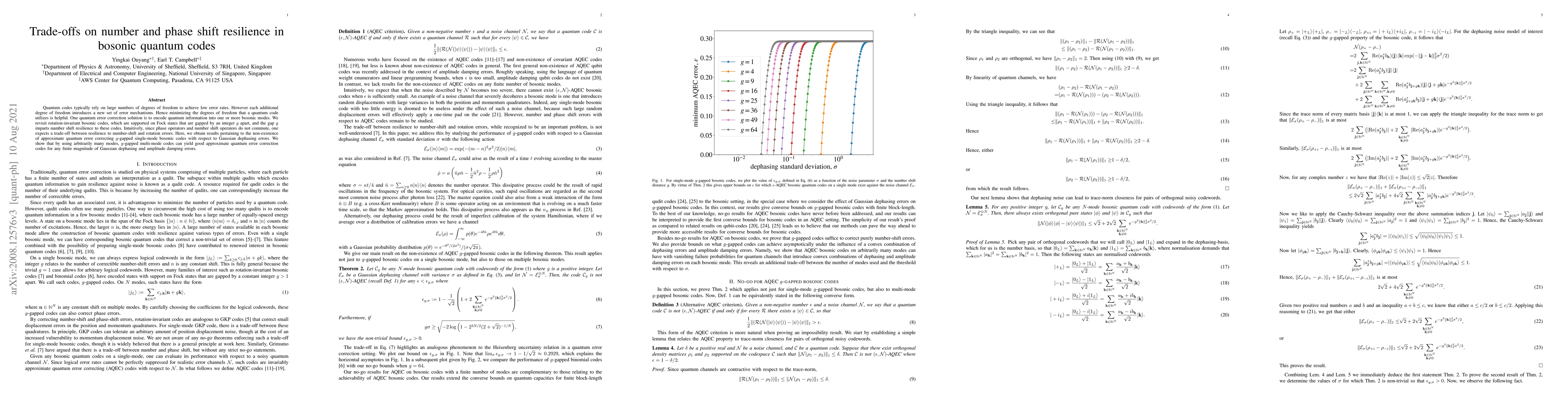 Quantum codes typically rely on large numbers of degrees of freedom to achieve low error rates. However each additional degree of freedom introduces a new set of error mechanisms. Hence minimizing the degrees of freedom that a quantum code utilizes is helpful. One quantum error correction solution is to encode quantum information into one or more bosonic modes. We revisit rotation-invariant bosonic codes, which are supported on Fock states that are gapped by an integer $g$ apart, and the gap $g$ imparts number shift resilience to these codes. Intuitively, since phase operators and number shift operators do not commute, one expects a trade-off between resilience to number-shift and rotation errors. Here, we obtain results pertaining to the non-existence of approximate quantum error correcting $g$-gapped single-mode bosonic codes with respect to Gaussian dephasing errors. We show that by using arbitrarily many modes, $g$-gapped multi-mode codes can yield good approximate quantum error correction codes for any finite magnitude of Gaussian dephasing and amplitude damping errors.