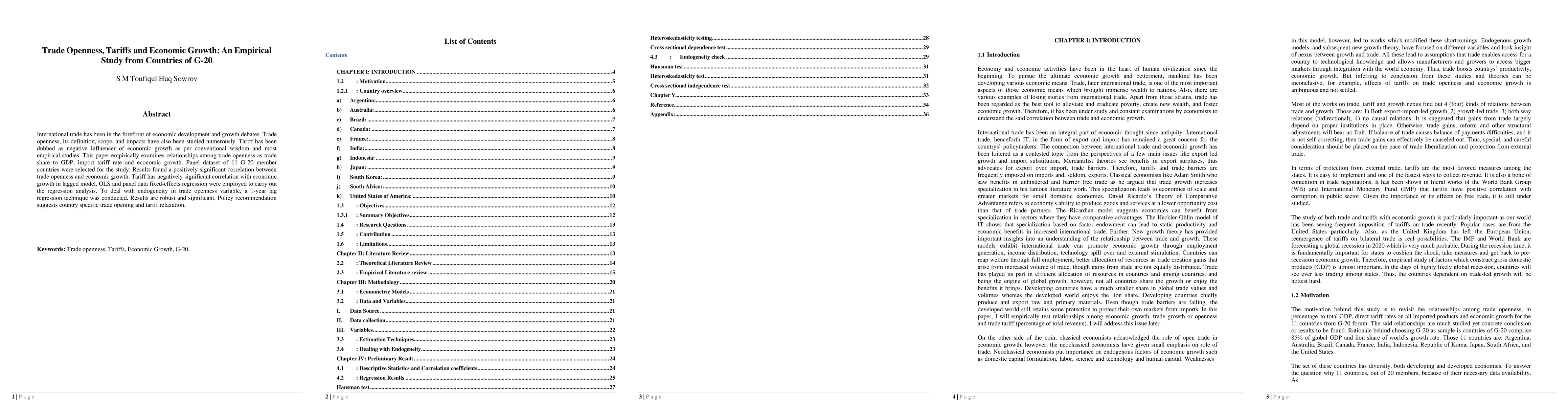 **Summary:** This paper investigates the relationship between trade openness, import tariffs, and economic growth among G-20 countries using panel data analysis. Findings reveal a positive correlation between trade openness and economic growth, while tariffs have a negative impact on growth, supporting policy recommendations for country-specific trade opening and tariff relaxation.