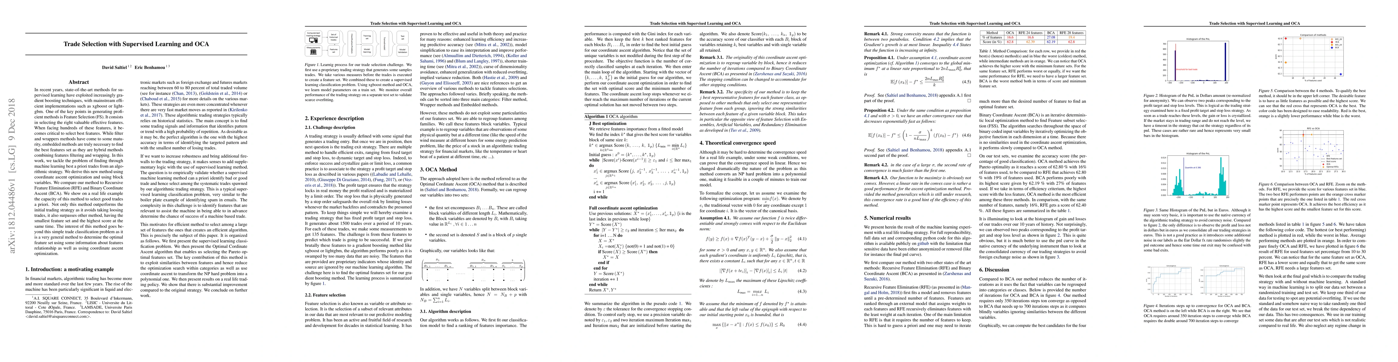 In recent years, state-of-the-art methods for supervised learning have exploited increasingly gradient boosting techniques, with mainstream efficient implementations such as xgboost or lightgbm. One of the key points in generating proficient methods is Feature Selection (FS). It consists in selecting the right valuable effective features. When facing hundreds of these features, it becomes critical to select best features. While filter and wrappers methods have come to some maturity, embedded methods are truly necessary to find the best features set as they are hybrid methods combining features filtering and wrapping. In this work, we tackle the problem of finding through machine learning best a priori trades from an algorithmic strategy. We derive this new method using coordinate ascent optimization and using block variables. We compare our method to Recursive Feature Elimination (RFE) and Binary Coordinate Ascent (BCA). We show on a real life example the capacity of this method to select good trades a priori. Not only this method outperforms the initial trading strategy as it avoids taking loosing trades, it also surpasses other method, having the smallest feature set and the highest score at the same time. The interest of this method goes beyond this simple trade classification problem as it is a very general method to determine the optimal feature set using some information about features relationship as well as using coordinate ascent optimization.