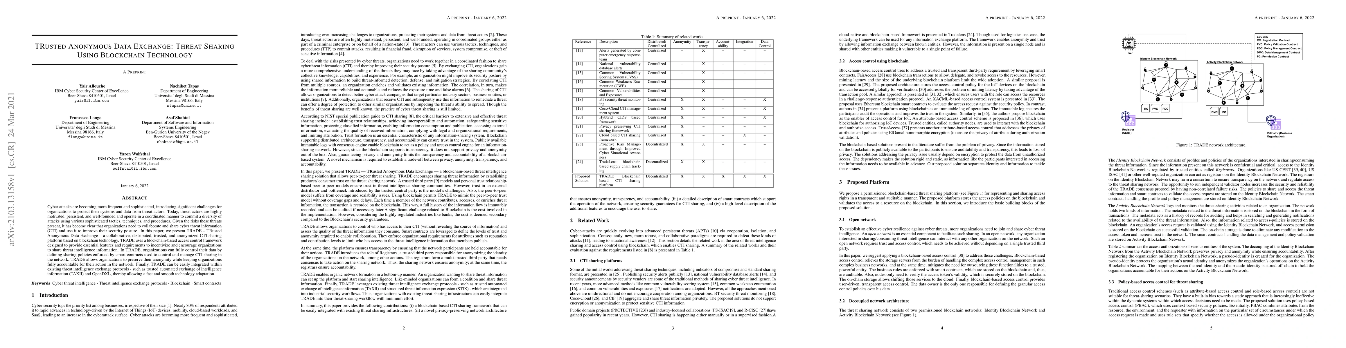 This paper introduces TRADE, a blockchain-based platform for collaborative, distributed, and anonymized cyber threat intelligence sharing, aiming to enhance security through shared information. TRADE employs a blockchain-based access control framework to incentivize data sharing while maintaining anonymity and accountability.