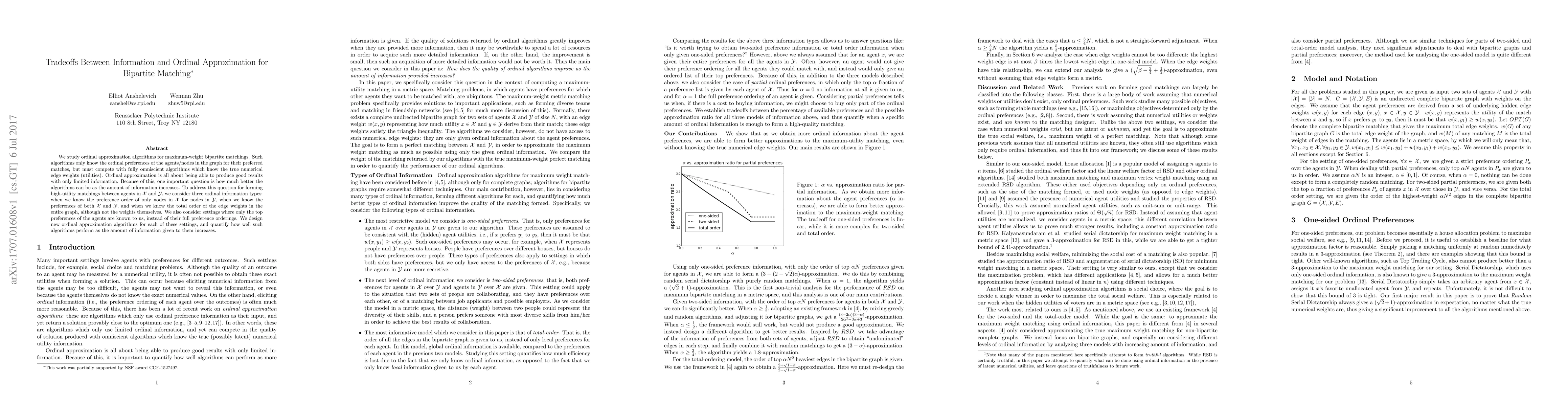 This research explores ordinal approximation algorithms for maximum-weight bipartite matchings, analyzing tradeoffs between limited ordinal preference information and fully known numerical edge weights. It introduces new algorithms for varying information levels, quantifying their performance as information increases, and considers top preferences over full orderings.