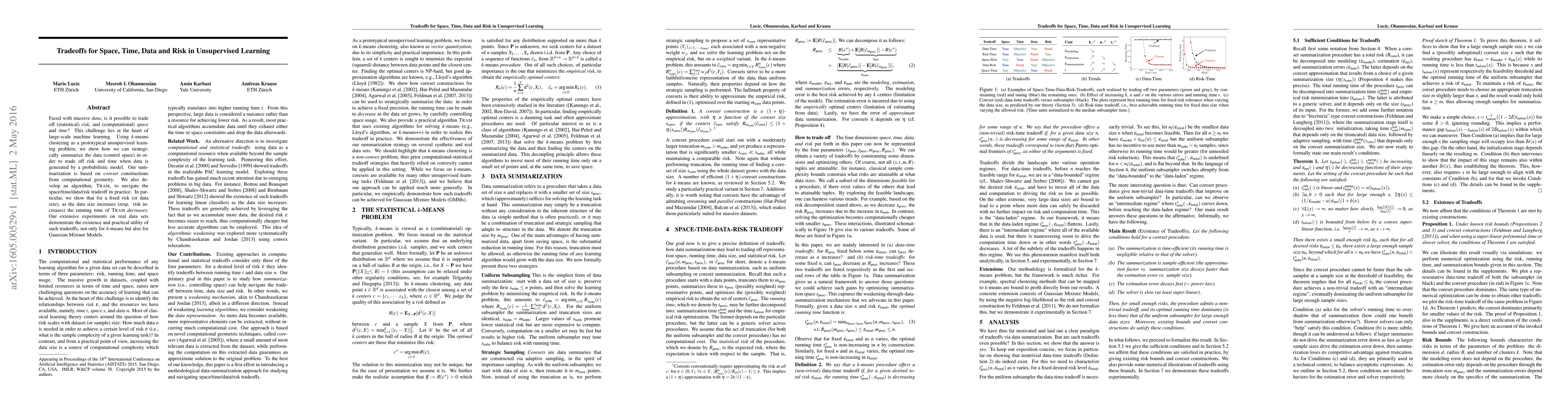 Faced with massive data, is it possible to trade off (statistical) risk, and (computational) space and time? This challenge lies at the heart of large-scale machine learning. Using k-means clustering as a prototypical unsupervised learning problem, we show how we can strategically summarize the data (control space) in order to trade off risk and time when data is generated by a probabilistic model. Our summarization is based on coreset constructions from computational geometry. We also develop an algorithm, TRAM, to navigate the space/time/data/risk tradeoff in practice. In particular, we show that for a fixed risk (or data size), as the data size increases (resp. risk increases) the running time of TRAM decreases. Our extensive experiments on real data sets demonstrate the existence and practical utility of such tradeoffs, not only for k-means but also for Gaussian Mixture Models.