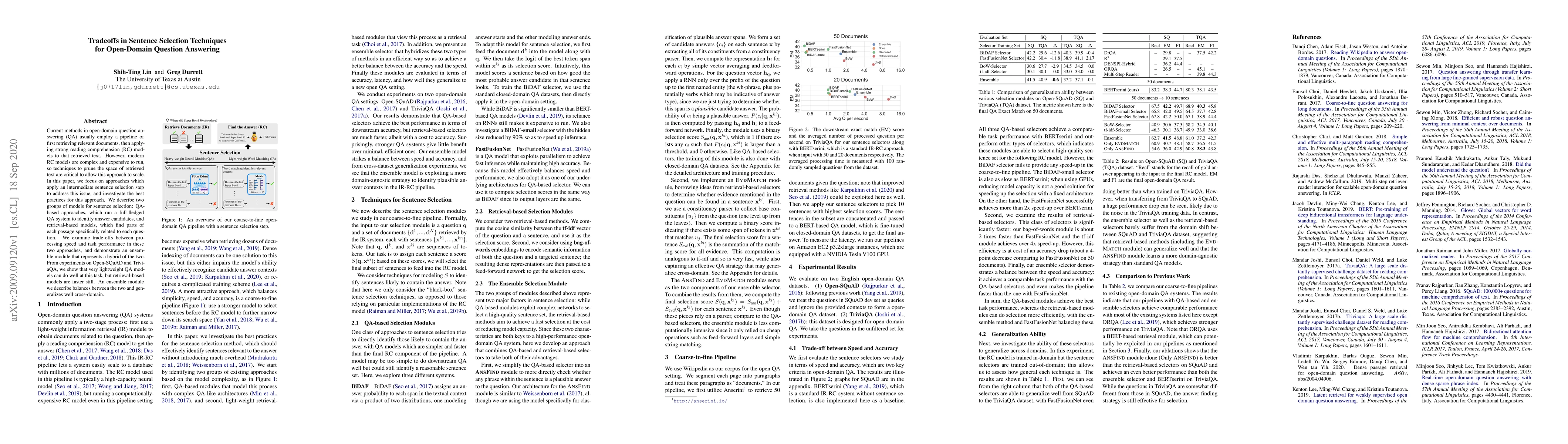 Current methods in open-domain question answering (QA) usually employ a pipeline of first retrieving relevant documents, then applying strong reading comprehension (RC) models to that retrieved text. However, modern RC models are complex and expensive to run, so techniques to prune the space of retrieved text are critical to allow this approach to scale. In this paper, we focus on approaches which apply an intermediate sentence selection step to address this issue, and investigate the best practices for this approach. We describe two groups of models for sentence selection: QA-based approaches, which run a full-fledged QA system to identify answer candidates, and retrieval-based models, which find parts of each passage specifically related to each question. We examine trade-offs between processing speed and task performance in these two approaches, and demonstrate an ensemble module that represents a hybrid of the two. From experiments on Open-SQuAD and TriviaQA, we show that very lightweight QA models can do well at this task, but retrieval-based models are faster still. An ensemble module we describe balances between the two and generalizes well cross-domain.