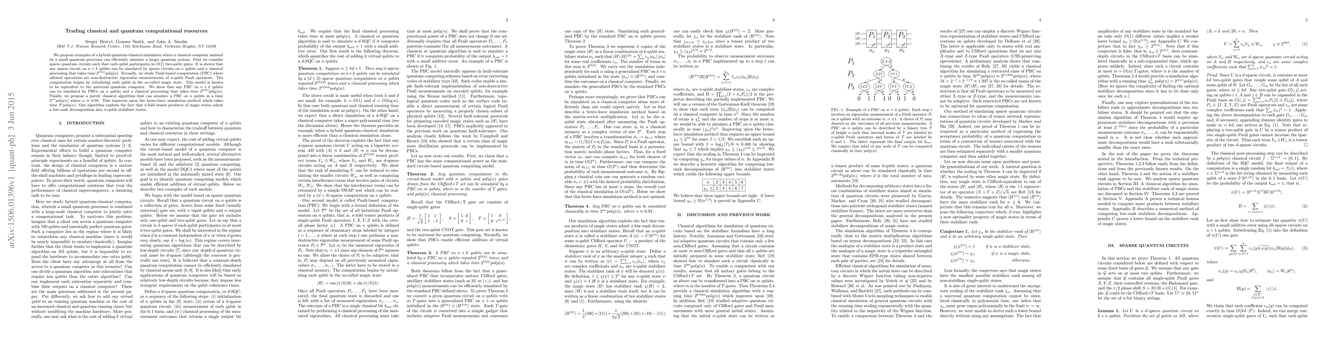 We propose examples of a hybrid quantum-classical simulation where a classical computer assisted by a small quantum processor can efficiently simulate a larger quantum system. First we consider sparse quantum circuits such that each qubit participates in O(1) two-qubit gates. It is shown that any sparse circuit on n+k qubits can be simulated by sparse circuits on n qubits and a classical processing that takes time $2^{O(k)} poly(n)$. Secondly, we study Pauli-based computation (PBC) where allowed operations are non-destructive eigenvalue measurements of n-qubit Pauli operators. The computation begins by initializing each qubit in the so-called magic state. This model is known to be equivalent to the universal quantum computer. We show that any PBC on n+k qubits can be simulated by PBCs on n qubits and a classical processing that takes time $2^{O(k)} poly(n)$. Finally, we propose a purely classical algorithm that can simulate a PBC on n qubits in a time $2^{c n} poly(n)$ where $c\approx 0.94$. This improves upon the brute-force simulation method which takes time $2^n poly(n)$. Our algorithm exploits the fact that n-fold tensor products of magic states admit a low-rank decomposition into n-qubit stabilizer states.