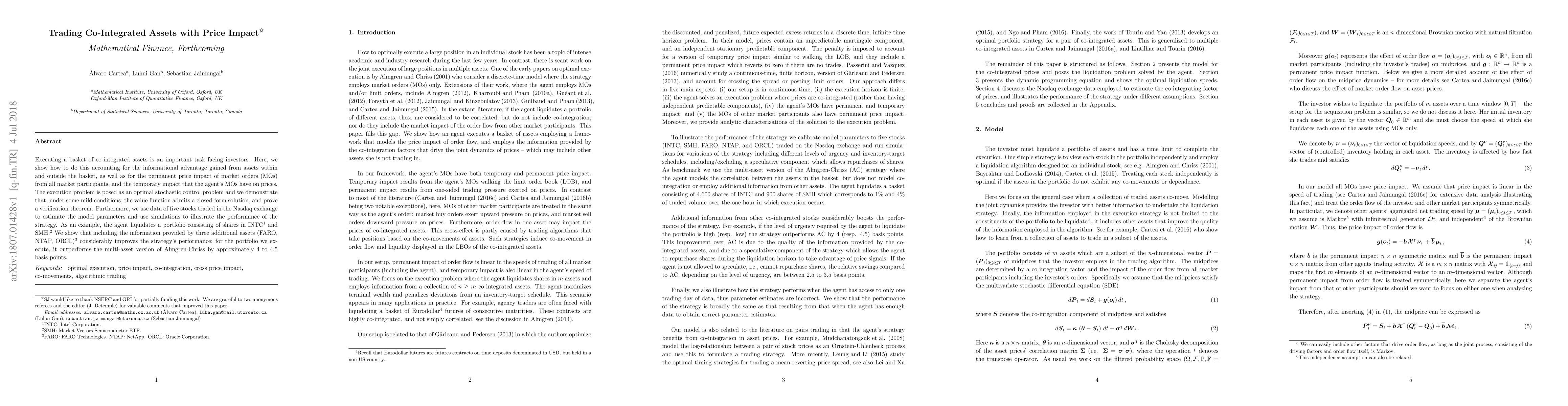 Executing a basket of co-integrated assets is an important task facing investors. Here, we show how to do this accounting for the informational advantage gained from assets within and outside the basket, as well as for the permanent price impact of market orders (MOs) from all market participants, and the temporary impact that the agent's MOs have on prices. The execution problem is posed as an optimal stochastic control problem and we demonstrate that, under some mild conditions, the value function admits a closed-form solution, and prove a verification theorem. Furthermore, we use data of five stocks traded in the Nasdaq exchange to estimate the model parameters and use simulations to illustrate the performance of the strategy. As an example, the agent liquidates a portfolio consisting of shares in Intel Corporation (INTC) and Market Vectors Semiconductor ETF (SMH). We show that including the information provided by three additional assets, FARO Technologies (FARO), NetApp (NTAP) and Oracle Corporation (ORCL), considerably improves the strategy's performance; for the portfolio we execute, it outperforms the multi-asset version of Almgren-Chriss by approximately 4 to 4.5 basis points.
