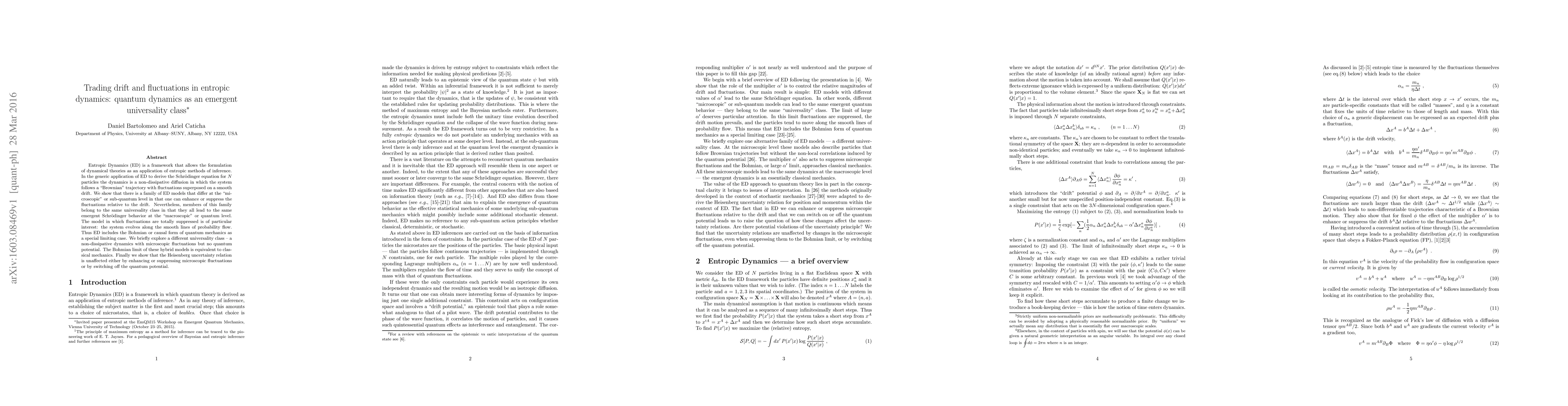 Entropic Dynamics (ED) provides a framework for deriving quantum mechanics through entropic inference, showing that various models with different levels of fluctuations still yield the same emergent Schrödinger behavior. ED includes the Bohmian mechanics as a special case where fluctuations are suppressed, while maintaining the Heisenberg uncertainty principle regardless of fluctuation levels.