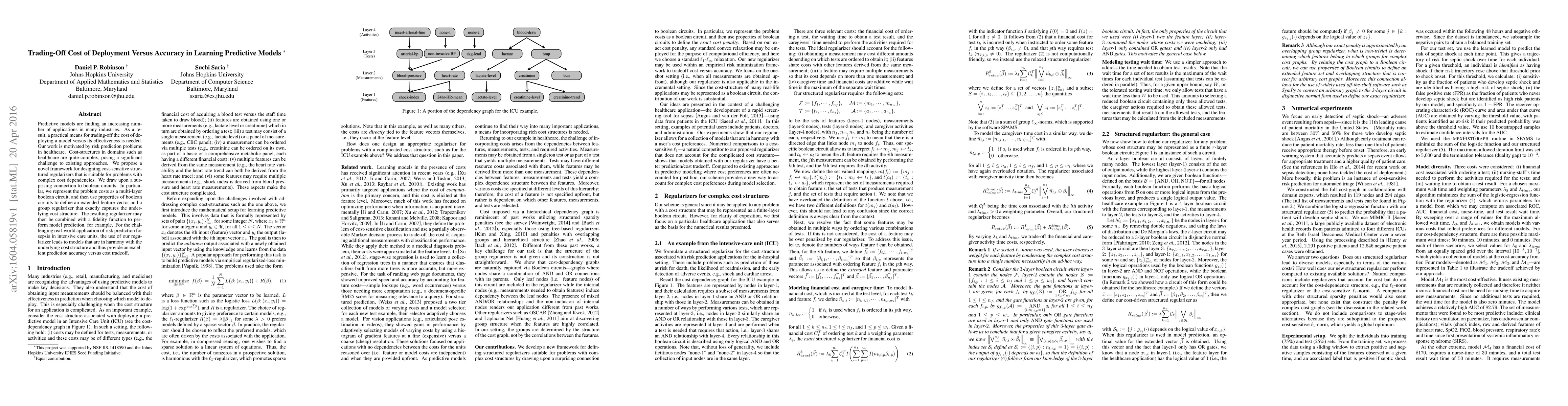 Predictive models are finding an increasing number of applications in many industries. As a result, a practical means for trading-off the cost of deploying a model versus its effectiveness is needed. Our work is motivated by risk prediction problems in healthcare. Cost-structures in domains such as healthcare are quite complex, posing a significant challenge to existing approaches. We propose a novel framework for designing cost-sensitive structured regularizers that is suitable for problems with complex cost dependencies. We draw upon a surprising connection to boolean circuits. In particular, we represent the problem costs as a multi-layer boolean circuit, and then use properties of boolean circuits to define an extended feature vector and a group regularizer that exactly captures the underlying cost structure. The resulting regularizer may then be combined with a fidelity function to perform model prediction, for example. For the challenging real-world application of risk prediction for sepsis in intensive care units, the use of our regularizer leads to models that are in harmony with the underlying cost structure and thus provide an excellent prediction accuracy versus cost tradeoff.