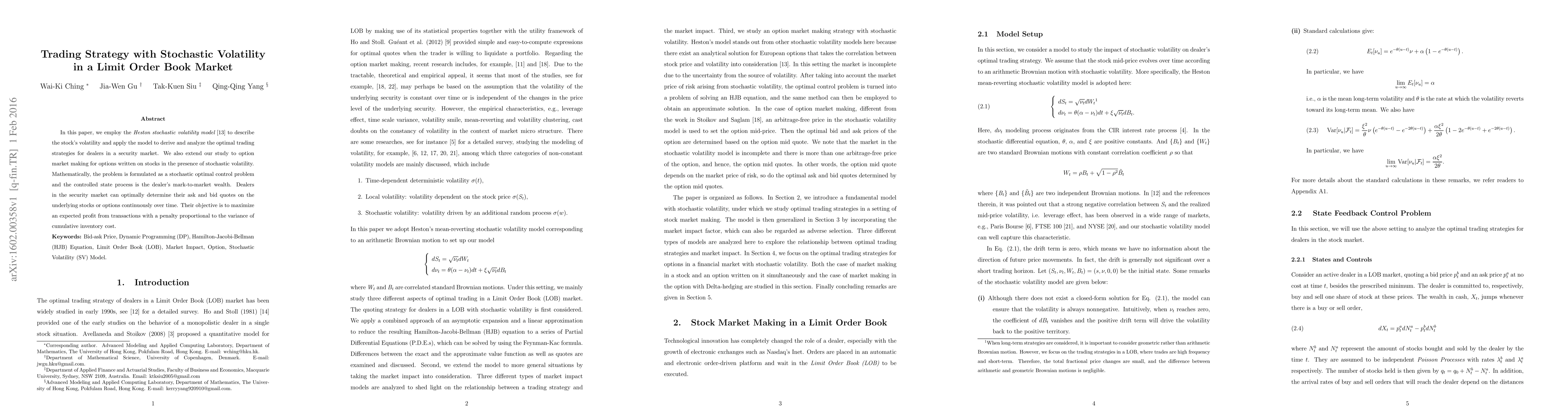 This paper uses the Heston stochastic volatility model to develop optimal trading strategies for dealers in limit order book markets, focusing on both stock and option market making. The study formulates the problem as a stochastic optimal control problem to maximize expected profit while penalizing inventory variance.