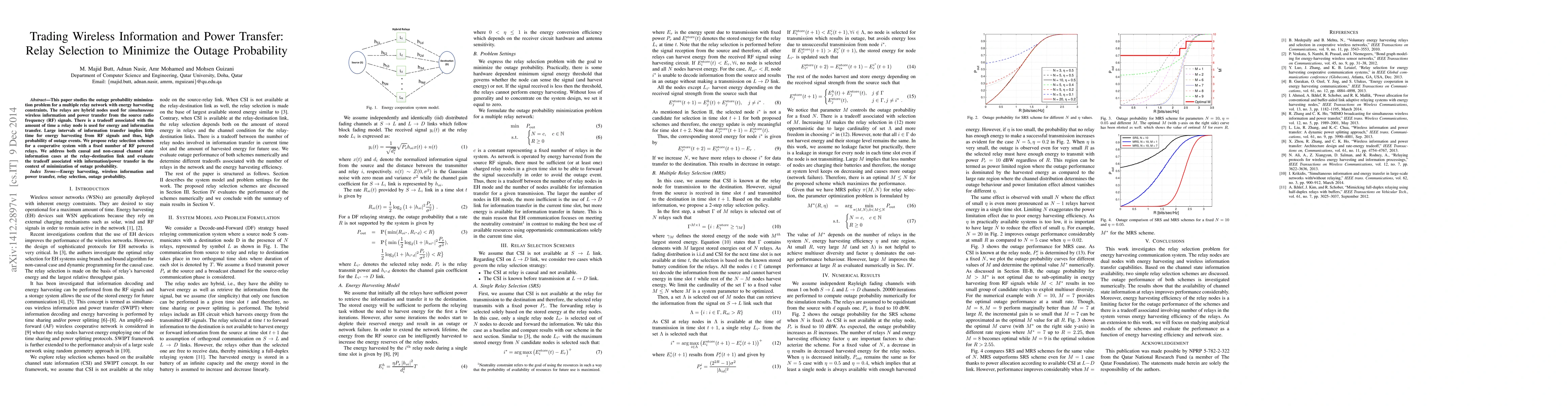 This paper proposes relay selection schemes to minimize outage probability in a multiple relay network with energy harvesting constraints, addressing both causal and non-causal channel state information scenarios. It evaluates the trade-off between wireless information and power transfer in a cooperative system with RF-powered relays.