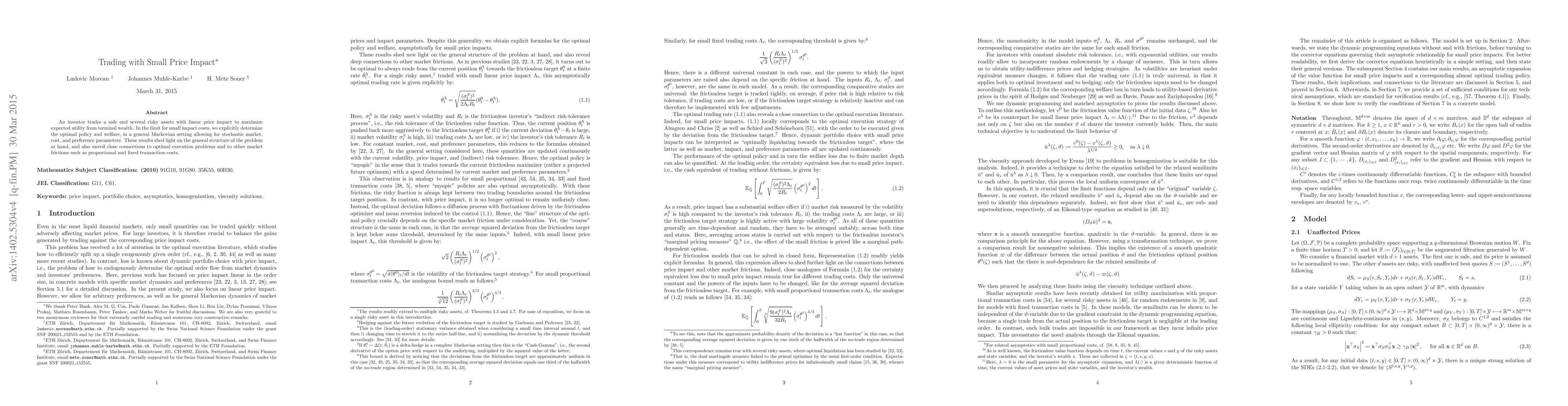An investor trades a safe and several risky assets with linear price impact to maximize expected utility from terminal wealth. In the limit for small impact costs, we explicitly determine the optimal policy and welfare, in a general Markovian setting allowing for stochastic market, cost, and preference parameters. These results shed light on the general structure of the problem at hand, and also unveil close connections to optimal execution problems and to other market frictions such as proportional and fixed transaction costs.