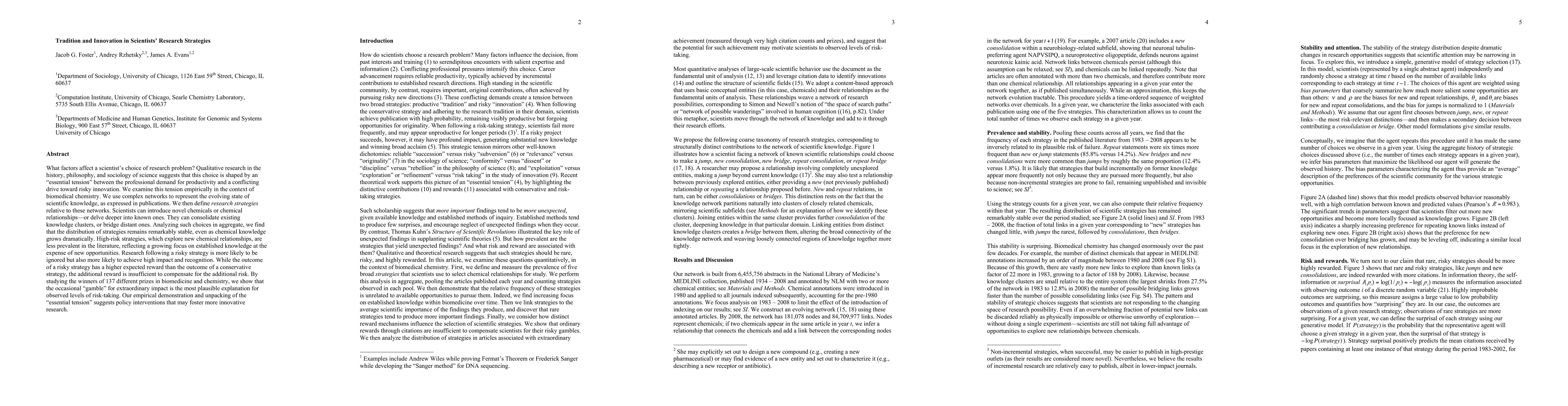 What factors affect a scientist's choice of research problem? Qualitative research in the history, philosophy, and sociology of science suggests that this choice is shaped by an "essential tension" between the professional demand for productivity and a conflicting drive toward risky innovation. We examine this tension empirically in the context of biomedical chemistry. We use complex networks to represent the evolving state of scientific knowledge, as expressed in publications. We then define research strategies relative to these networks. Scientists can introduce novel chemicals or chemical relationships--or delve deeper into known ones. They can consolidate existing knowledge clusters, or bridge distant ones. Analyzing such choices in aggregate, we find that the distribution of strategies remains remarkably stable, even as chemical knowledge grows dramatically. High-risk strategies, which explore new chemical relationships, are less prevalent in the literature, reflecting a growing focus on established knowledge at the expense of new opportunities. Research following a risky strategy is more likely to be ignored but also more likely to achieve high impact and recognition. While the outcome of a risky strategy has a higher expected reward than the outcome of a conservative strategy, the additional reward is insufficient to compensate for the additional risk. By studying the winners of 137 different prizes in biomedicine and chemistry, we show that the occasional "gamble" for extraordinary impact is the most plausible explanation for observed levels of risk-taking. Our empirical demonstration and unpacking of the "essential tension" suggests policy interventions that may foster more innovative research.